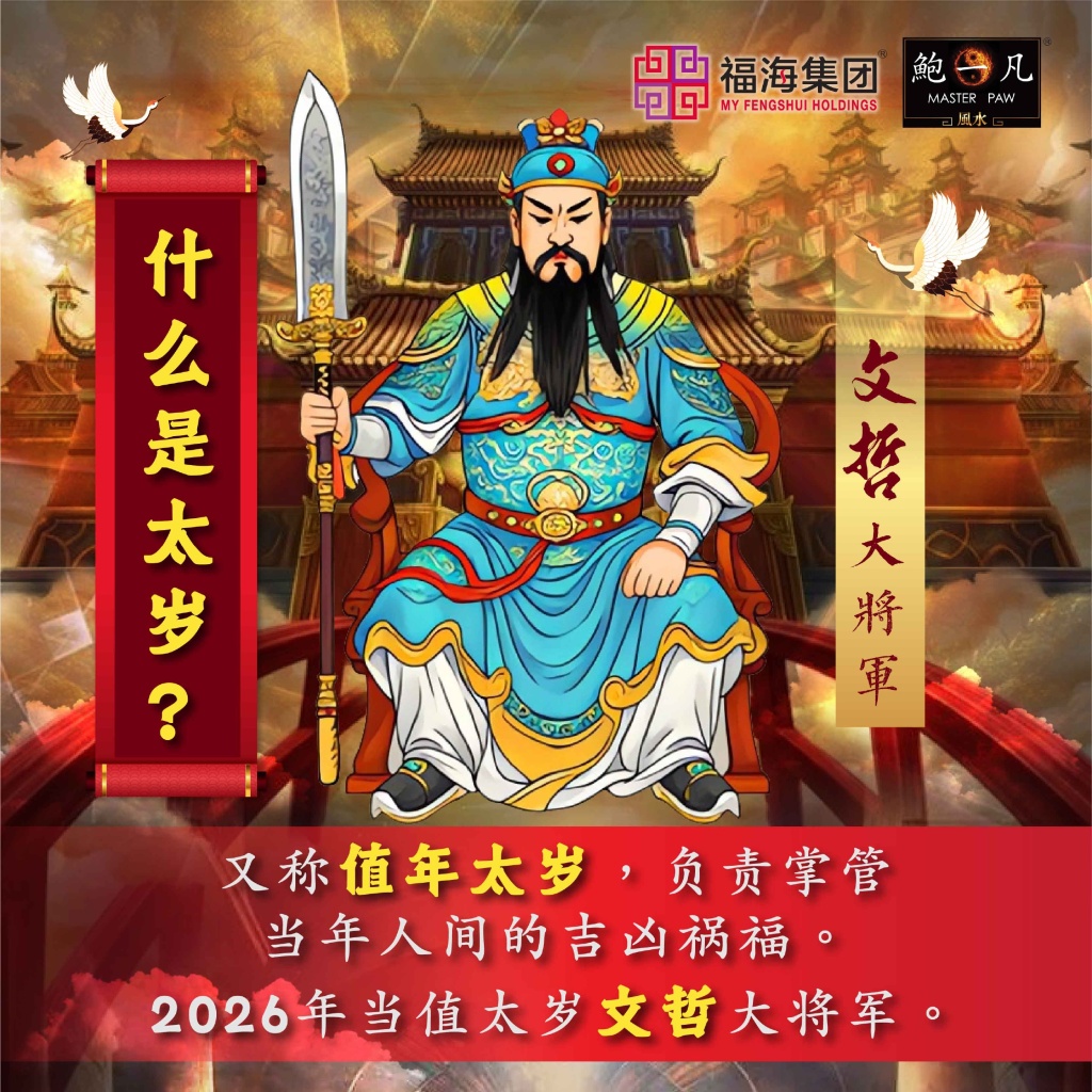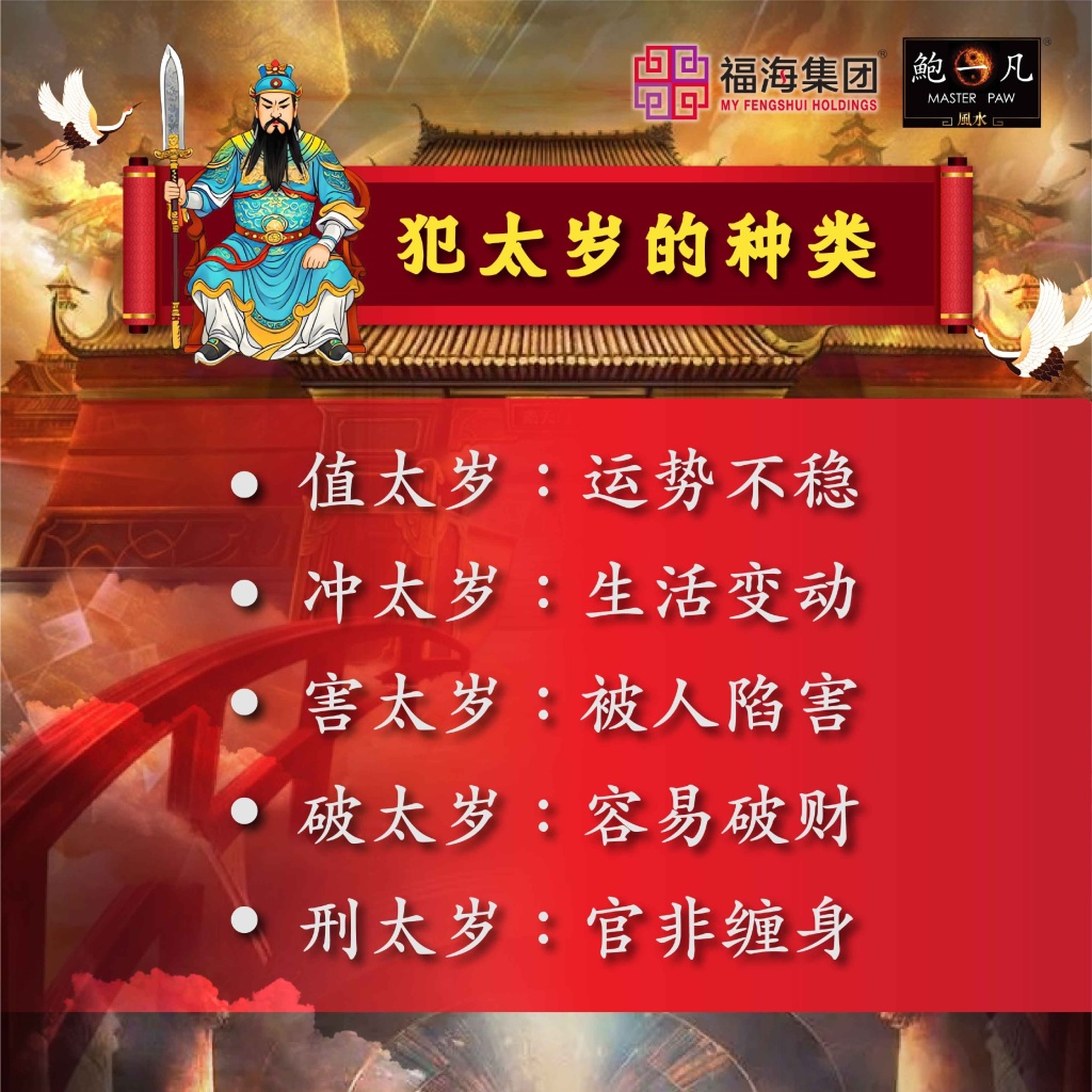 Tai Sui, also known as the Year Deity or Grand Duke Jupiter, There are sixty Tai Sui deities who take turns overseeing the human world.Each year, one specific Tai Sui is“in charge,” responsible for inspecting the mortal realm, judging good and evil, and governing the fortunes and misfortunes of the year.犯太岁有分五种,这五种犯太岁的性质与严重程度不同,所面对的负面影响也会跟着不同。