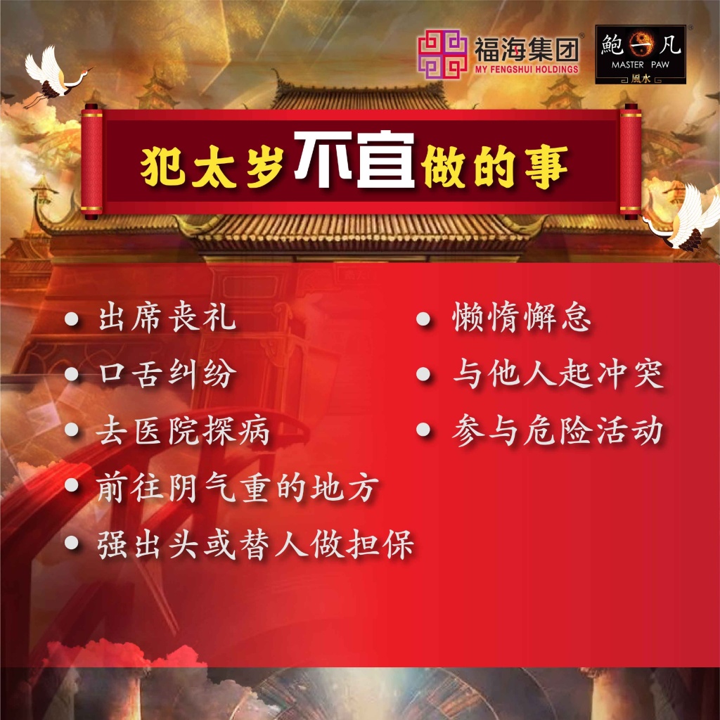 冲太岁:“冲”字有“对冲”、“相冲”的意思,其严重程度比值太岁还要猛烈,流年冲太岁时,生活上会出现巨大的变动,例如裁员、分手、离婚、搬家、生病等情况,需要做好万全准备去应对。