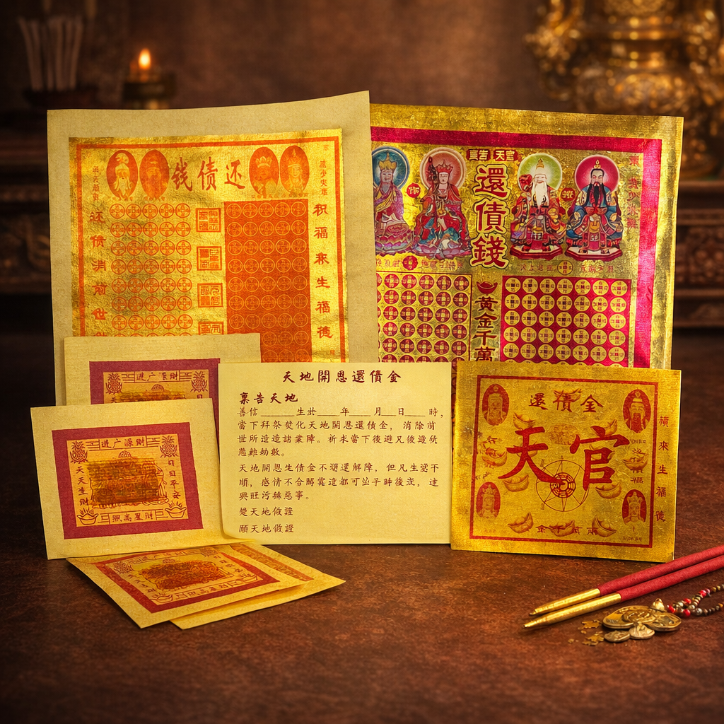天地开恩还债金用于化解业债、清还无形欠账的焚烧金纸天地开恩还债金,是用于向天地、神明陈情请恩,偿还累世因果、业债、人情债、无形欠账的传统焚烧金纸。在民俗观念中,人生不顺、运势反复、财来财去、事事受阻,往往并非努力不足,而是债未清、账未了。焚烧天地开恩还债金,象征向天地请恩、向因果交代,先还债,再转运。