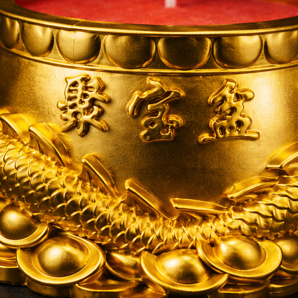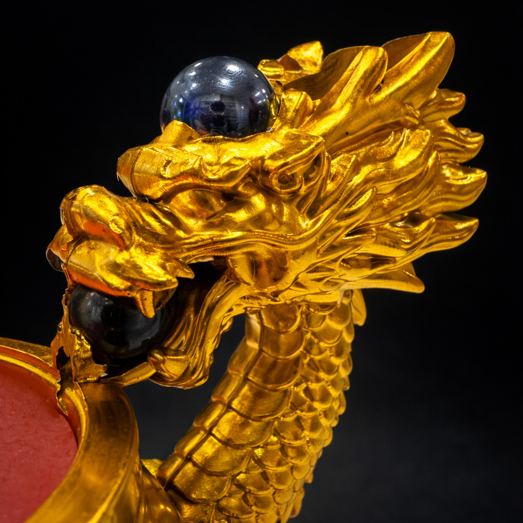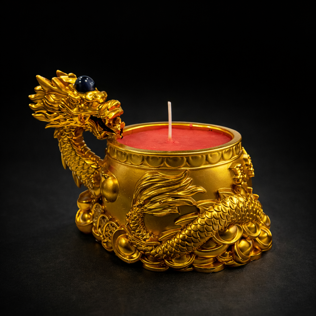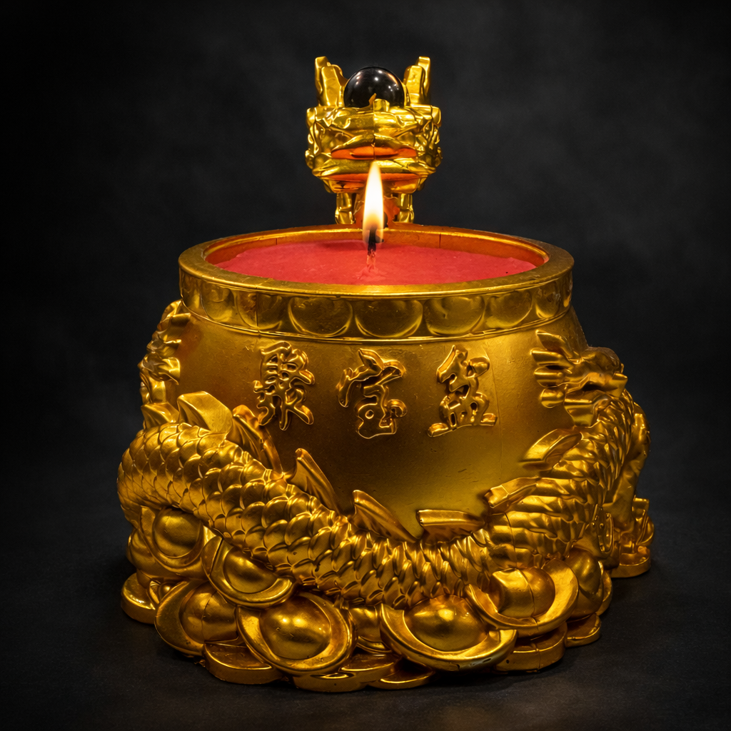 烛台主体采用鎏金色调设计,祥龙盘绕烛身,龙首昂扬,龙鳞与须鬃细节层次分明,整体比例饱满。龙在传统象征中主权势、主护持、主财库镇守,寓意财气不散、福泽归位。底部结合元宝元素与立体浮雕结构,象征聚财纳福、财源汇聚、根基稳固。