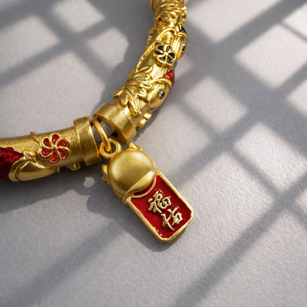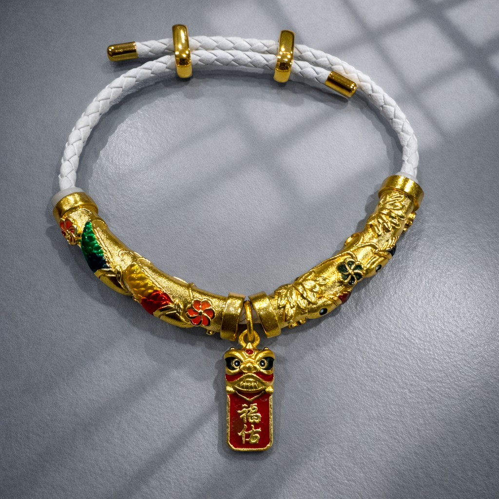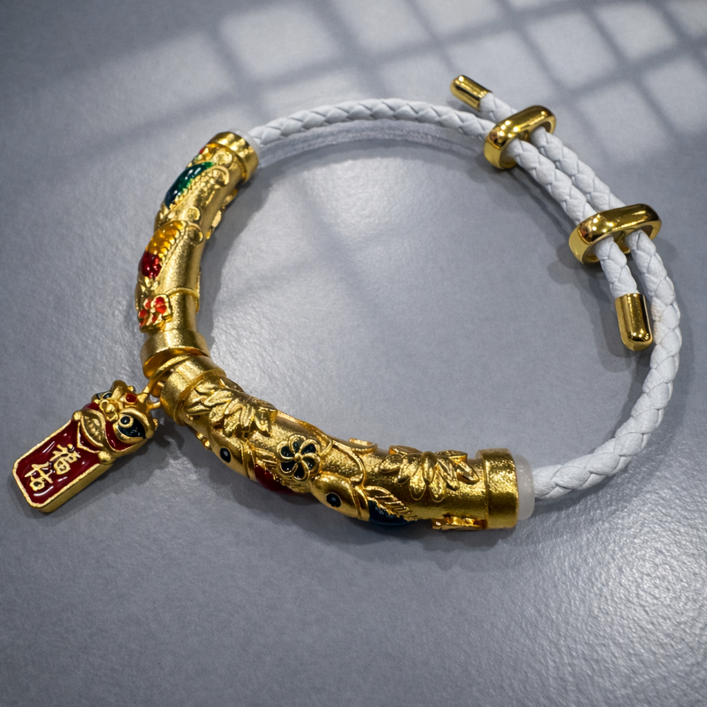 福佑守护手绳以白绳为底,象征清净与平衡,配以鎏金护佑件,寓意正气在身、福运随行。中央垂坠守护瑞兽与「福佑」铭文,一护气场,一镇心神,将祝福化为日常可感的陪伴。这份守护,不是强势的阻挡,而是在纷扰之中,为你留下一份稳定的底气。当外界变化再多,内心仍能安定不乱;当压力来临,方向依旧清晰。