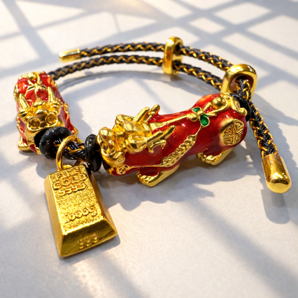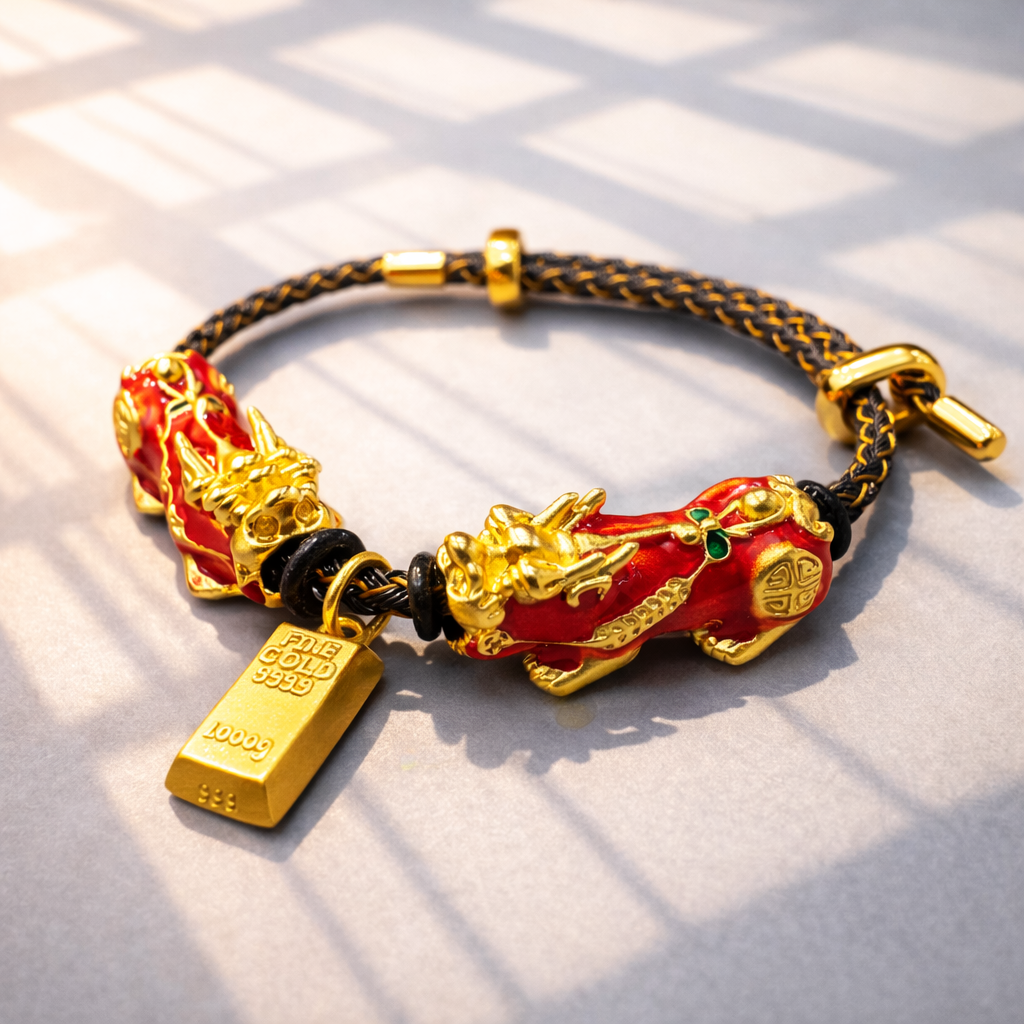 这条手绳以红金为主调,象征财气流动、运势通达;双貔貅相向而立,一守一引,寓意守财不漏、引财入库;金砖垂坠其间,代表实在之财,所求不虚、所得可见。整体结构讲究「动中有收、来而能留」,不是一时偏财,而是让正财、机会与贵人持续靠近。适合在事业推进、投资决策、转换跑道或需要提升财运节奏时佩戴,让每一步都走在对的方向上。