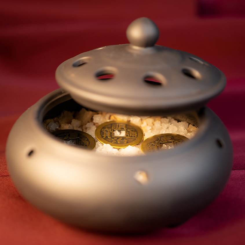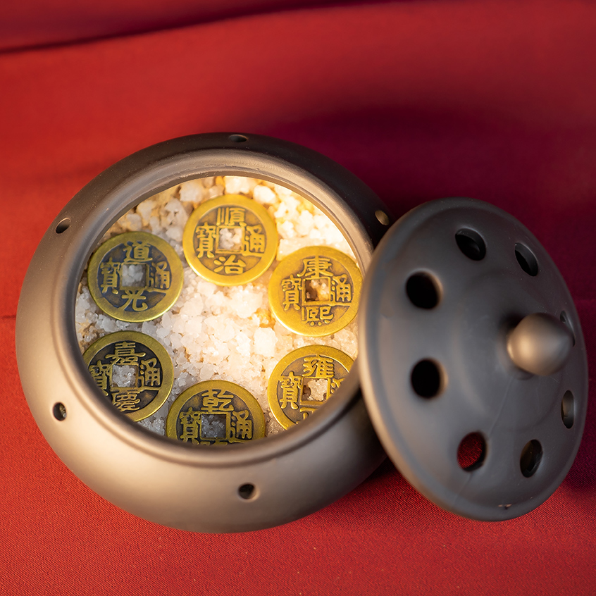 你只需将海盐和檀香分倒入容器内,将六帝钱铺平在海盐和檀香粉之上,再以纯净的清水(建议用天然山泉水、或过滤的海水)倒入容器内,直到盖过海盐和檀香粉,这样即可成为风水法宝,适合摆放在家中化解流年风水中的五黄与病符煞气,并且还可带来避邪、安稳情绪、平衡家中磁场……等多种正向的风水益处。
