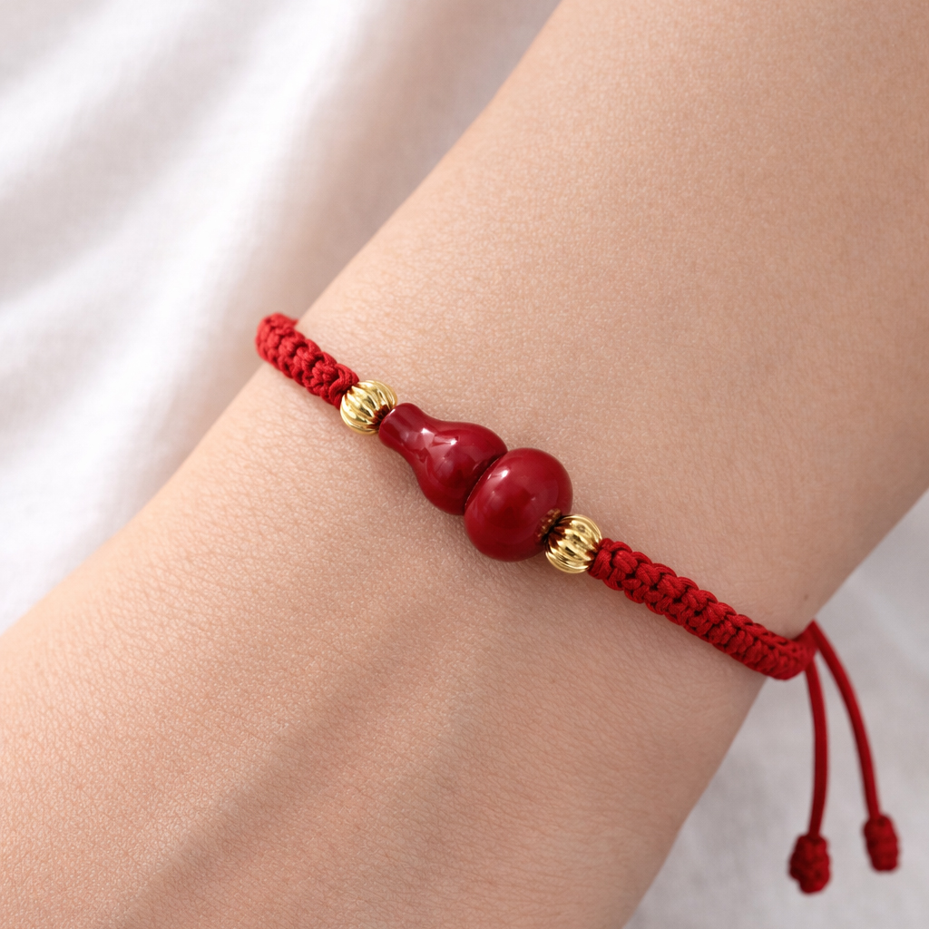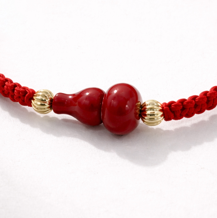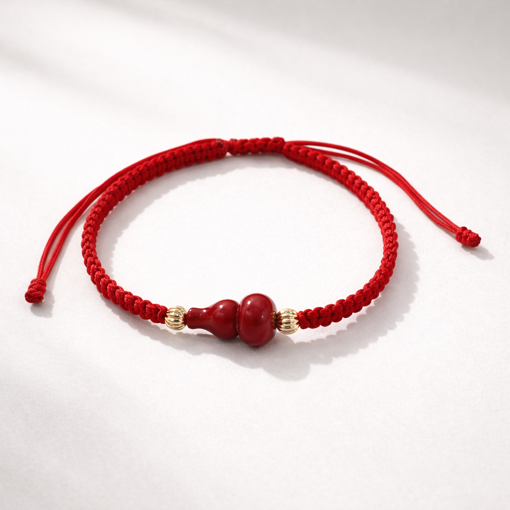 朱砂纳福手绳以传统红绳编织为基础,搭配朱砂葫芦主件,整体设计简洁稳重。朱砂色泽温润内敛,适合日常佩戴不张扬,同时保有传统文化与实用佩戴性的平衡。