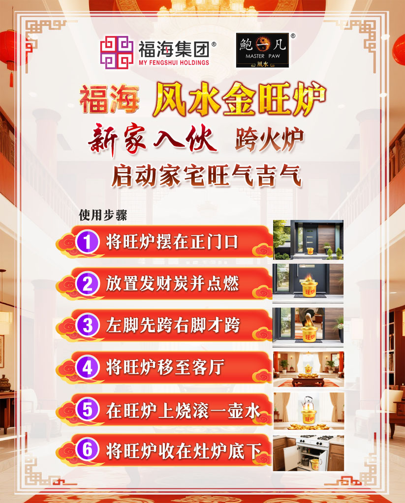 1. 摆放炉具:搬家当天,将未点燃的金旺炉放置大门外侧中央,象征开门迎财。