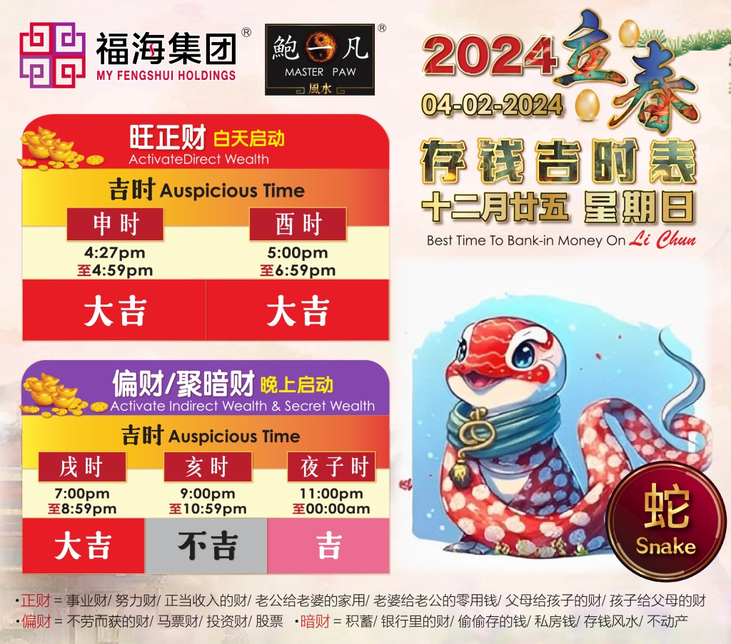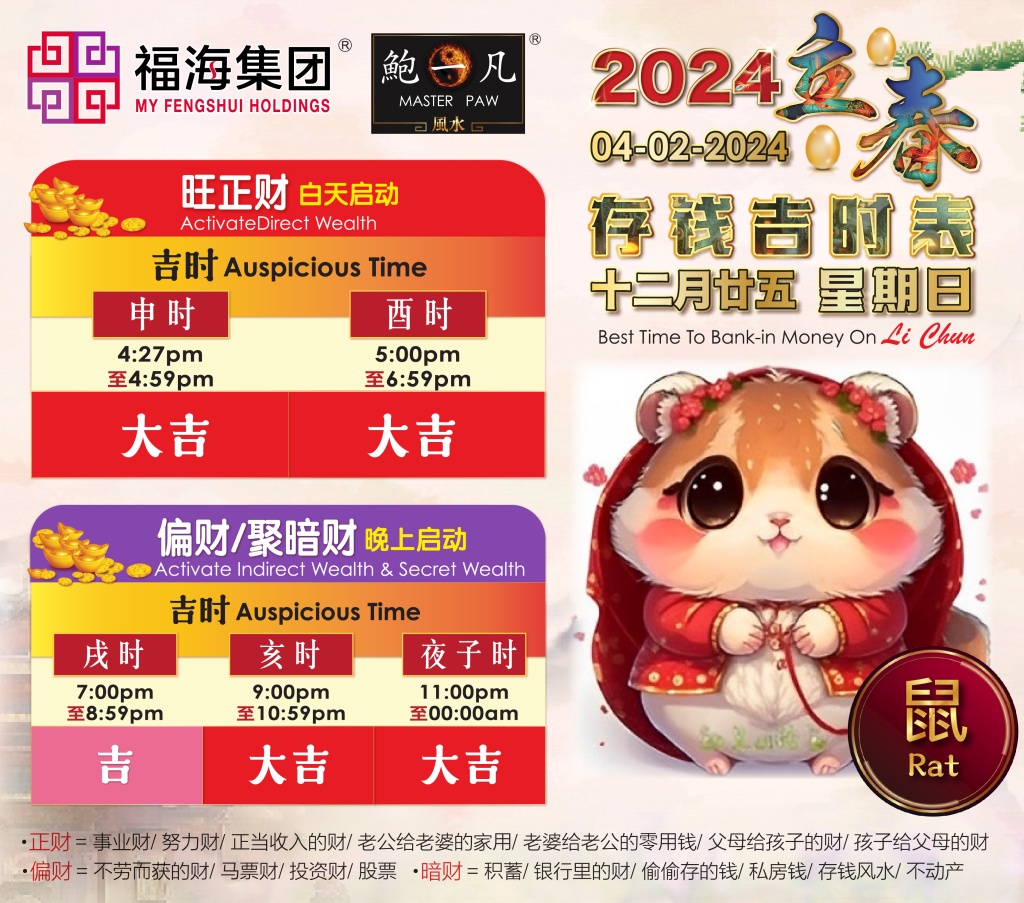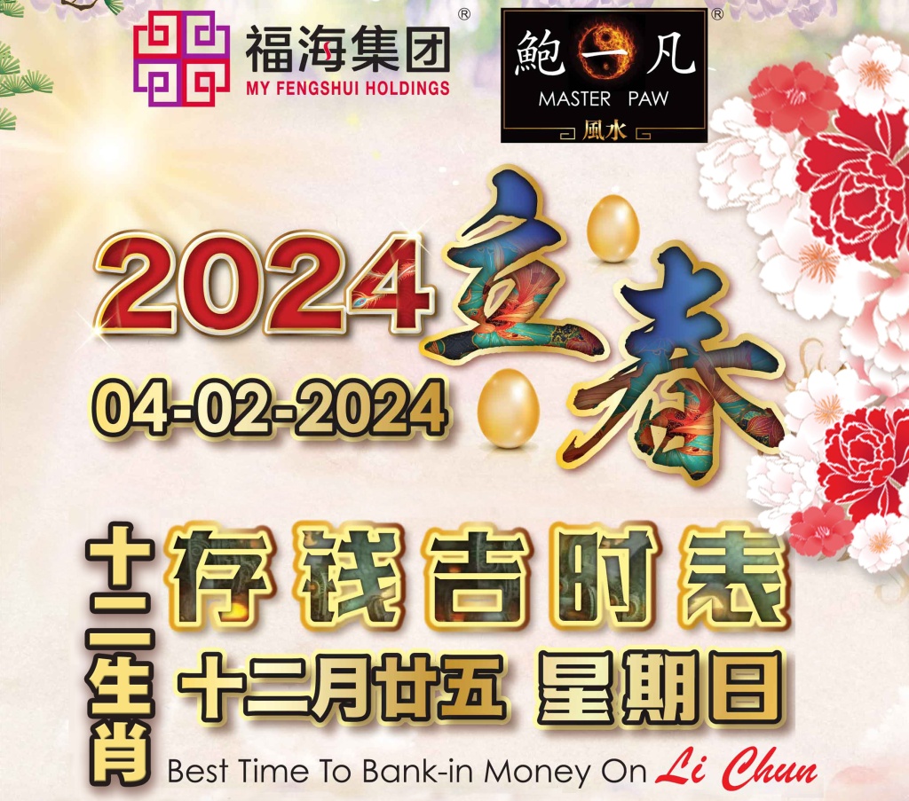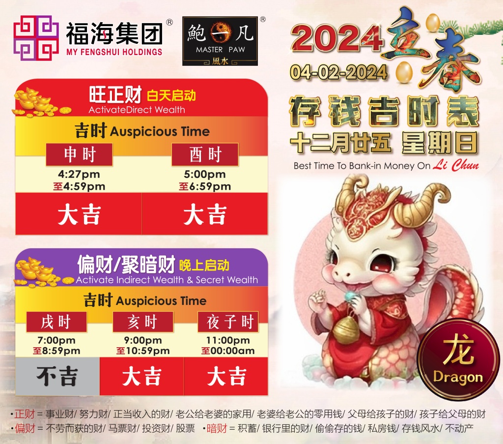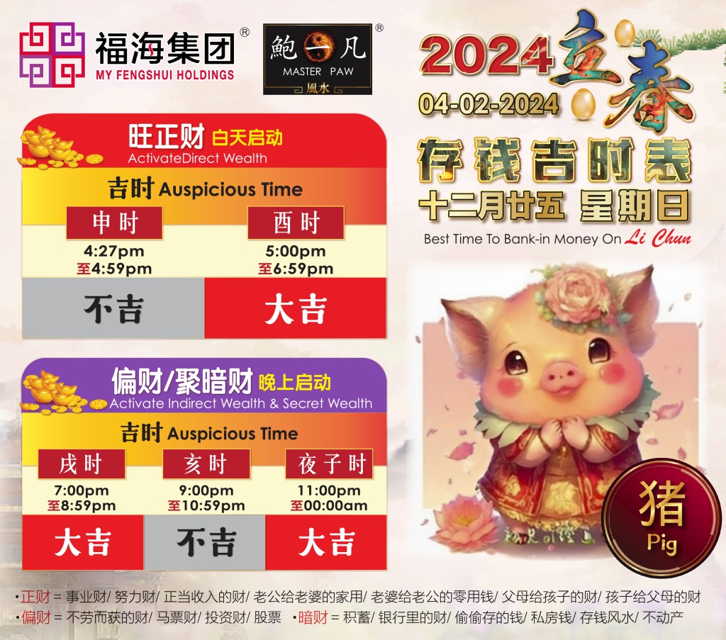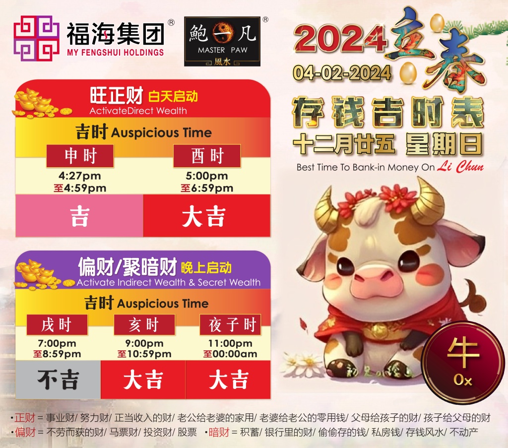 以上就是鲍一凡老师与大家分享的「2024十二生肖立春存钱吉时表」,希望大家好好利用吉时为自己启动正财和偏财运,来年一起赚大钱发大财!!