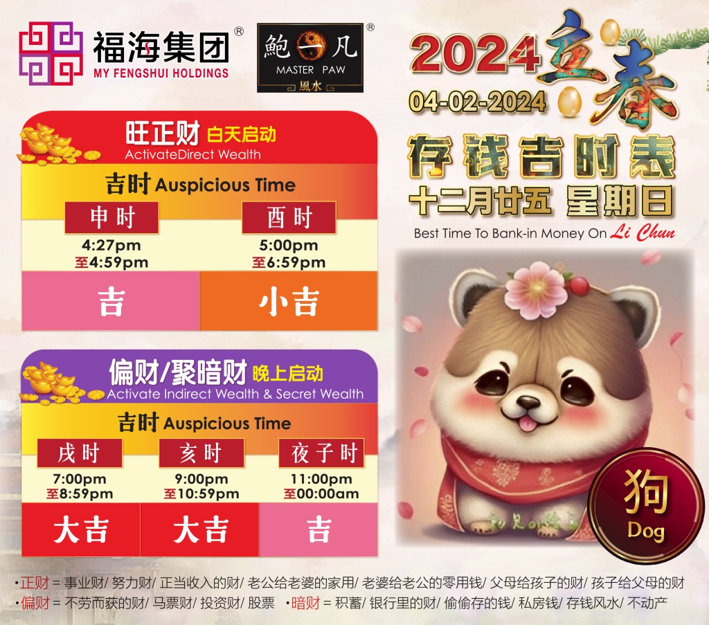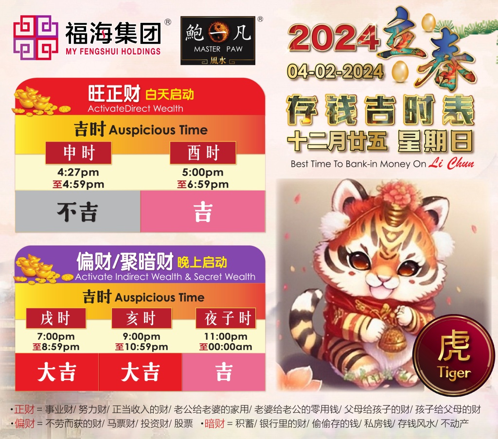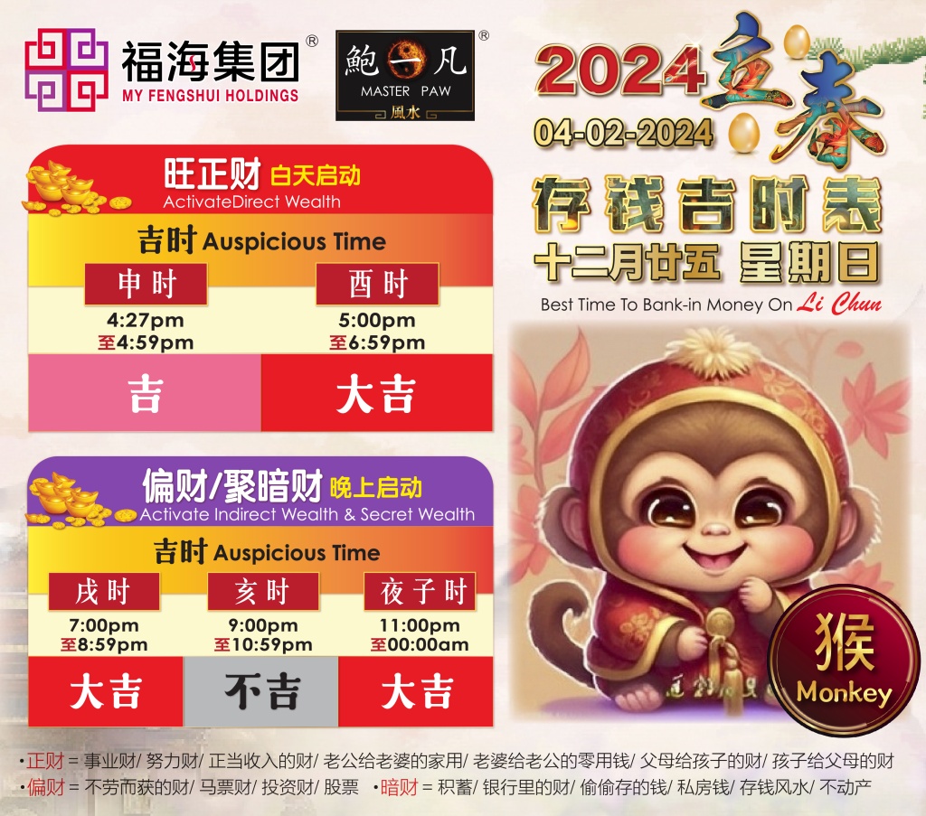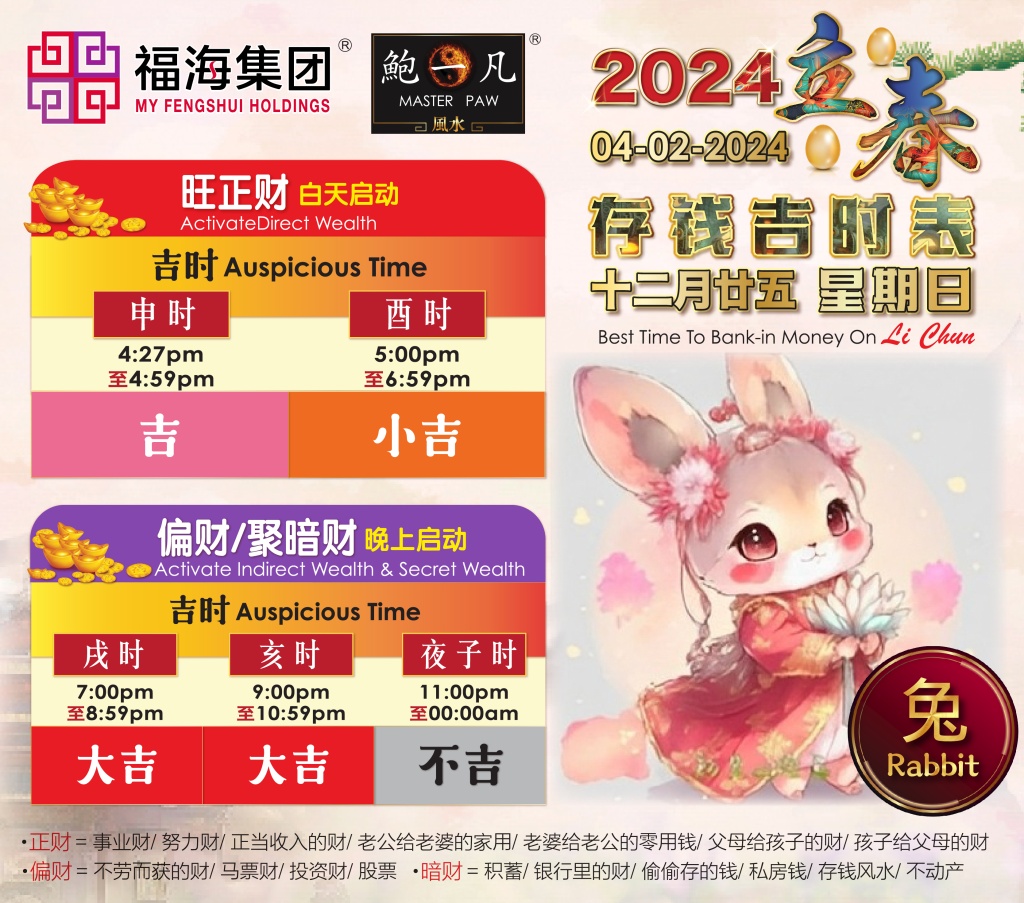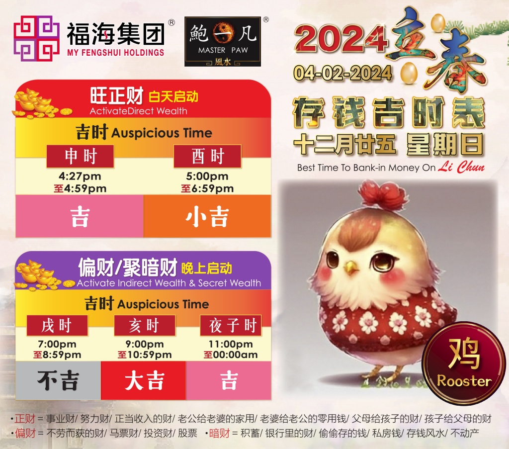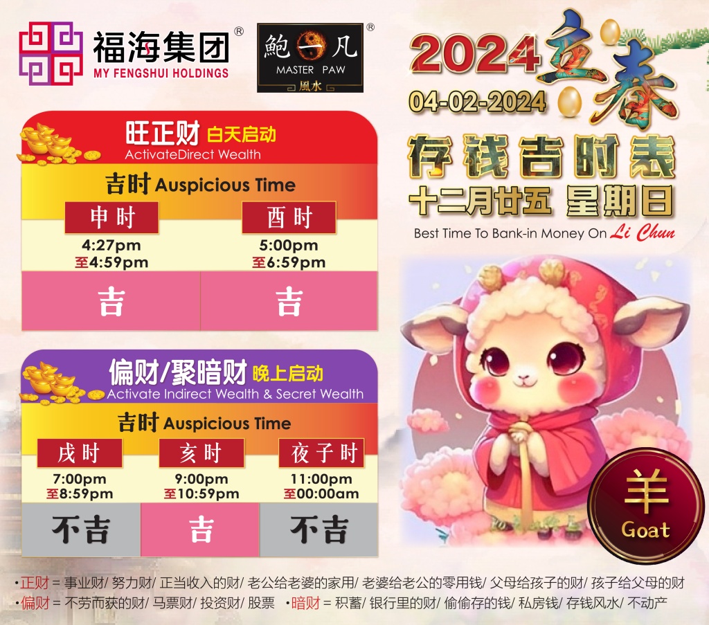 以上就是鲍一凡老师与大家分享的「2024十二生肖立春存钱吉时表」,希望大家好好利用吉时为自己启动正财和偏财运,来年一起赚大钱发大财!!