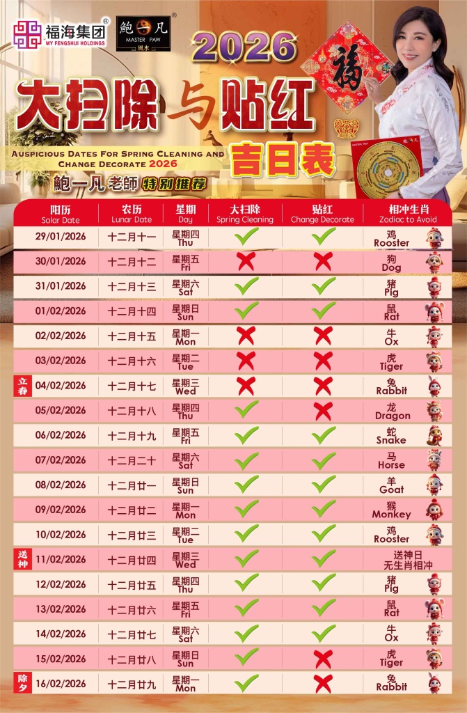 为了让大扫除与贴红的过程更加顺利、圆满,鲍一凡老师特别整理并推荐【2026大扫除与贴红吉日表】供大家参考。大家只要避开与自身生肖相冲的日子,再择一良辰吉日进行,便可顺势借助吉日能量,帮助家宅气场顺畅流转,让转运事半功倍,开启阖家平安、万事顺遂的全新篇章!