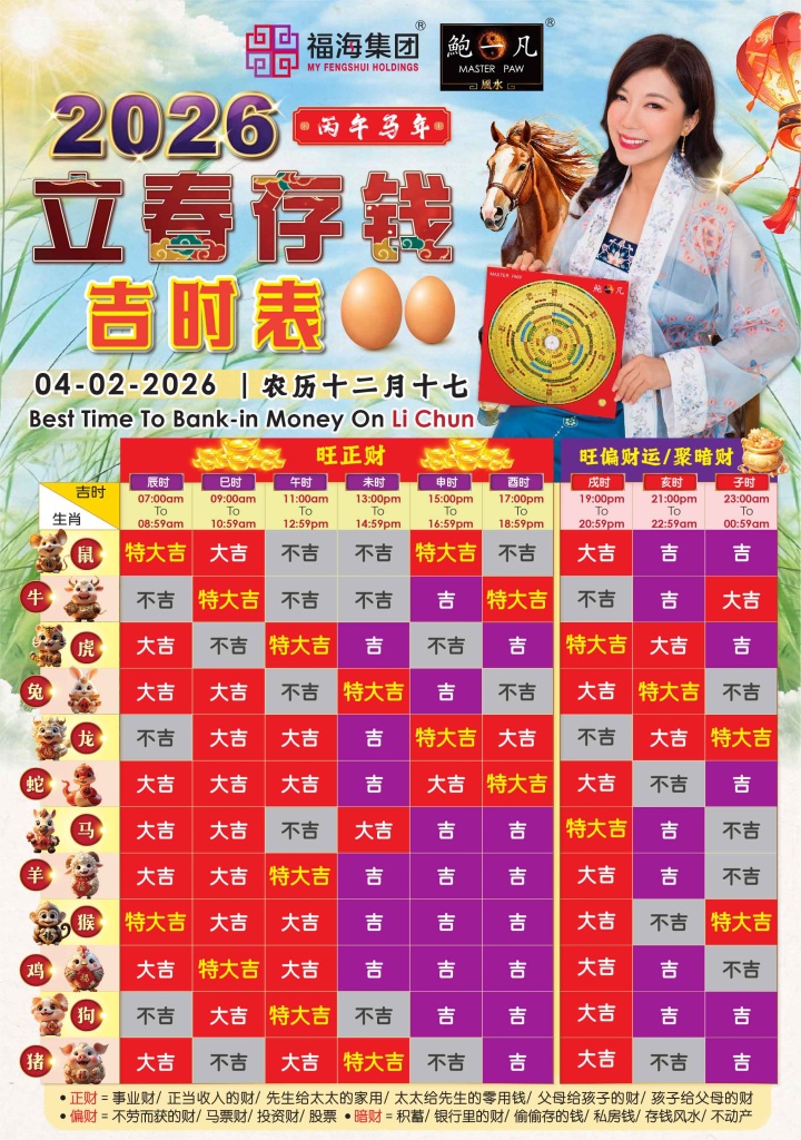 迎接立春的方式众多,其中“立春存钱”被视为极为重要的开运仪式之一。依循民俗信仰,在立春当天存钱,象征为新一年开启财库、启动财气,不仅有助于提升正财与偏财能量,更寓意财源顺畅、累积丰盛。为协助大众精准把握立春能量,鲍一凡老师特别准备了【2026立春存钱吉时表】供民众参考,以便在合适的时辰启动财运布局。