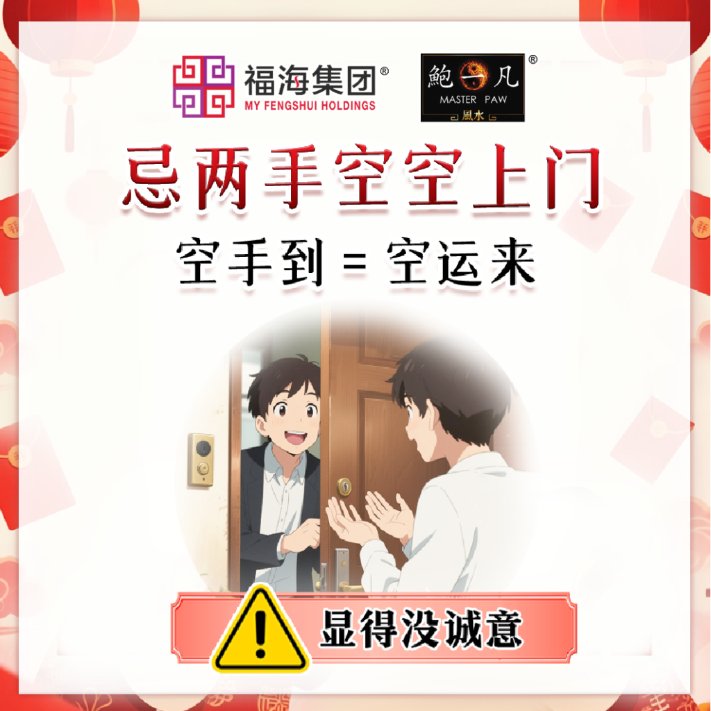 带上两粒柑橘、一盒年饼或糖果去拜年,都是最基本的诚意,但若两手空空,既显得没诚意,也象征把空缺、消耗之气带进别人家里,同时要尽量避免使用空盒子或空袋子,因为在象征意义上属于“空财”。