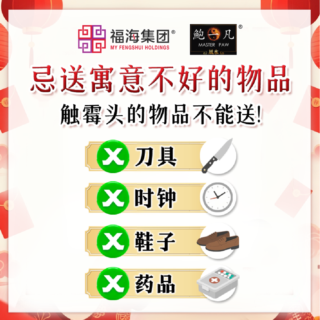 过年送礼讲究的是吉利,但寓意不好的物品例如刀具、剪刀有“断”、“伤”和煞气之意;钟有“送终”谐音;破损或有裂纹的礼盒象征一年不完整;药品象征抱病一整年,非常不吉利。