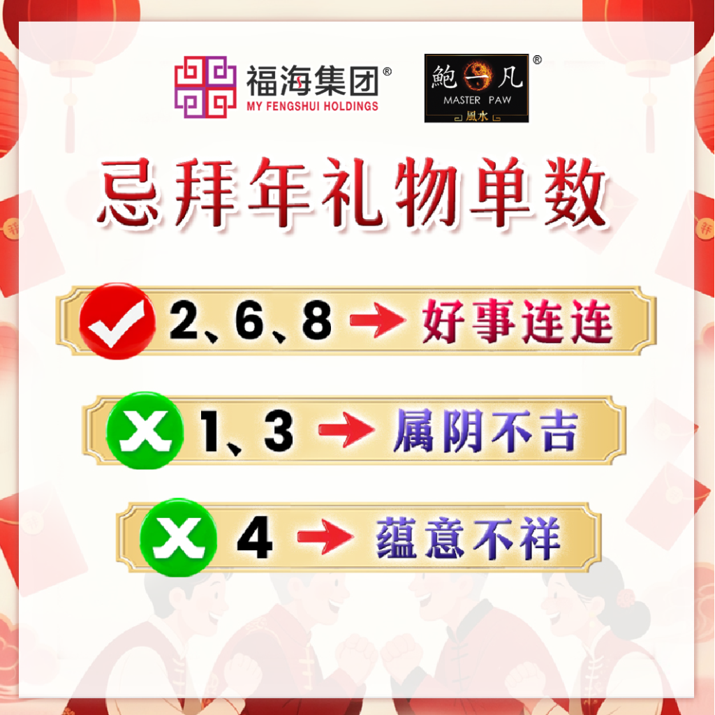 多数地区偏好双数,象征成双成对、好事连连,准备礼物时记得选2、6、8等讨喜的数字,同时也要避开1、3、5等象征单薄、孤立的单数,单数4更不推荐,因为4谐音“死”,非常不吉利。