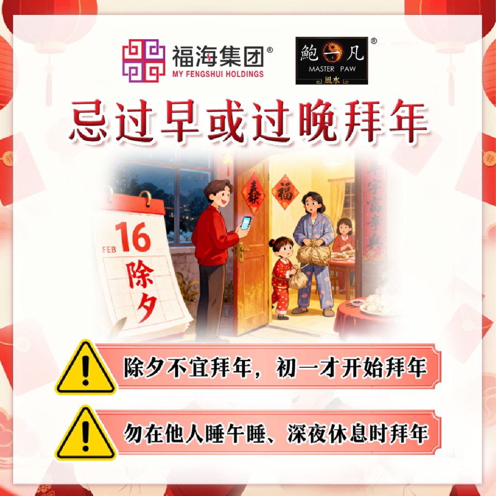 传统上认为除夕是团圆的日子,而初一中午是拜年的黄金时间,所以不宜在除夕当天或初一早上拜年,也尽量避免在他人睡觉的时候登门拜访,以免催促他人醒来。