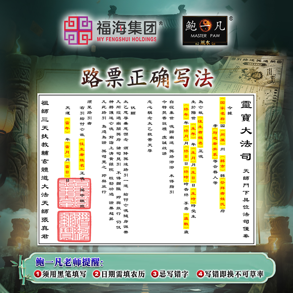 鲍一凡老师特别提醒,填写的时候需用黑笔填写、日期需写农历,也需要细心避免写错字。如果写错了最好换一张重写,毕竟这份路票就等于是一份正式的文件,要想真正起到作用就绝对不能草率对待。