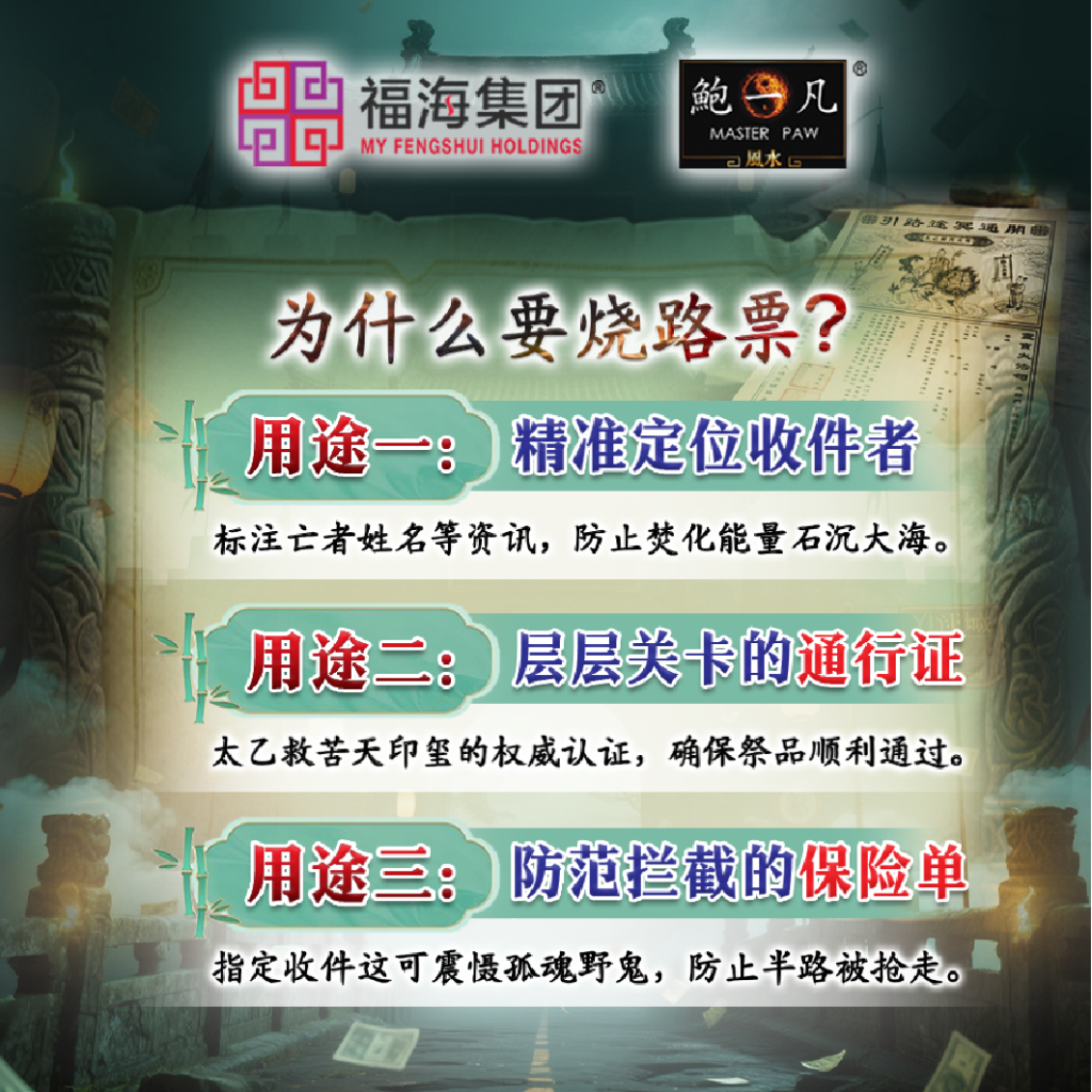 我们要明白,在传统民俗中,阴阳两界隔绝的界限和管理制度其实非常严苛,所以在这之间流通的一切自然有着等级森严、秩序井然的系统,而烧去给阴间的东西,也当然需要有经过层层把关。所以,你可以将路票当作是财物的“身份证”与“所有权证”。