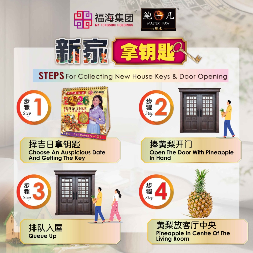 拿新家的钥匙,第一步骤就是择吉日,这是老祖宗流传下来的生活智慧,目的就是要趋吉避凶,顺利接好运,而在新家拿钥匙之前,择吉日有助于催旺新家。挑选吉日时,需根据男主人的生辰八字和五行命理来推算最适合的日子和时间,也要避开与自身生肖相冲的日子,这样做什么事都会事半功倍。你可以参考【风水日历】找出适合的吉日。
