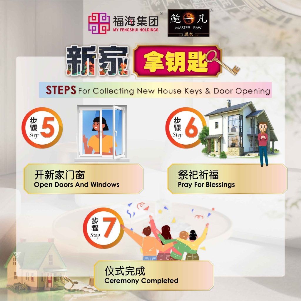 开门仪式完成后,建议新家主人与参与者逗留片刻,感受并适应新家的气场,在离开新家前,务必将黄梨和供品一并带回家,象征将吉利和旺气带回现居。同时记得把门窗关闭、锁好,以防止刚转换的气场再度被室外的阴气或秽气污染,影响未来的家运。