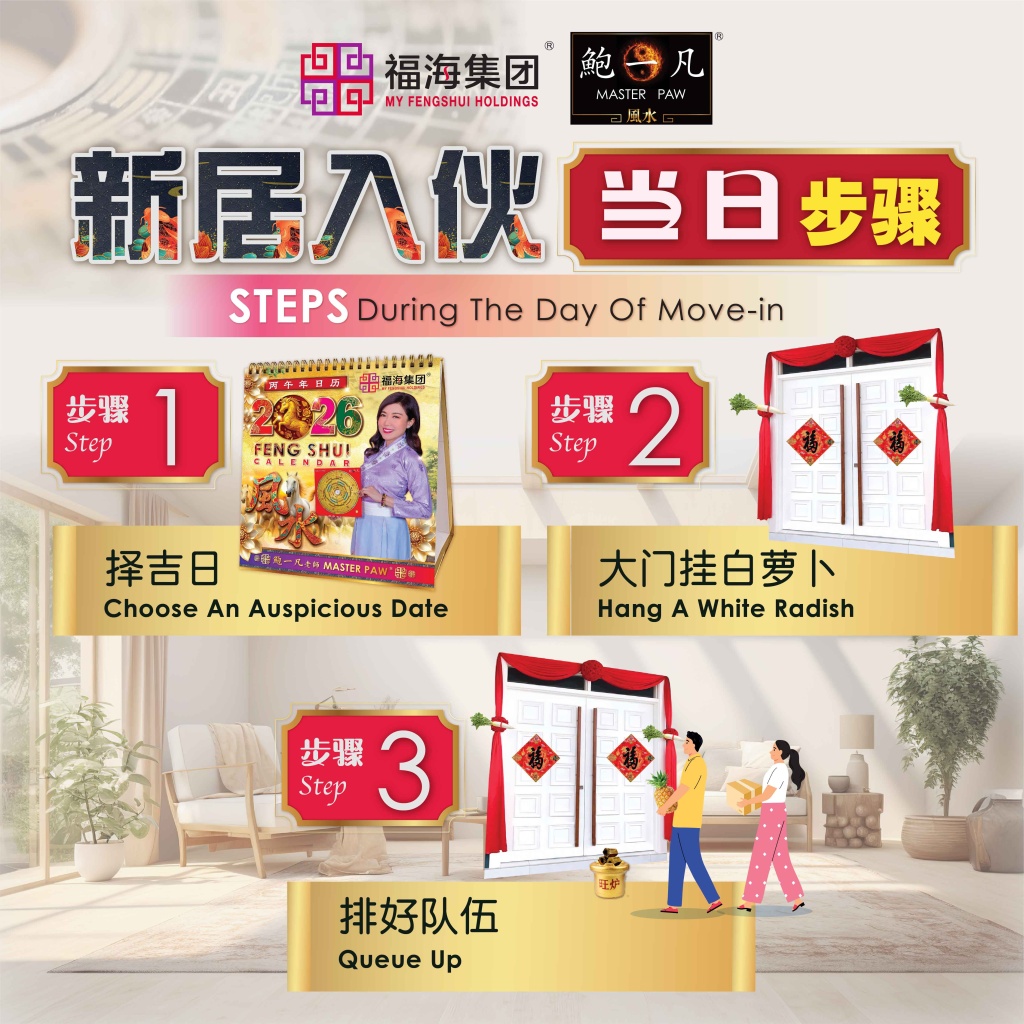在进行新家入伙的时候,最重要的一步就是择吉日。择吉日,是老祖宗留下的生活智慧,目的就是要趋吉避凶,顺利迎接好运。挑选吉日时,需根据男主人的生辰八字和五行命理来推算最适合的日子和时间。选对了吉日吉时,做什么事都会事半功倍。你可以参考【风水日历】找出适合的入伙吉日。如果想更精确一点,可以考虑报名【择吉日服务】,并根据你的生辰八字挑选出专属的吉日吉时,让入伙当天一切圆满、好运连连。