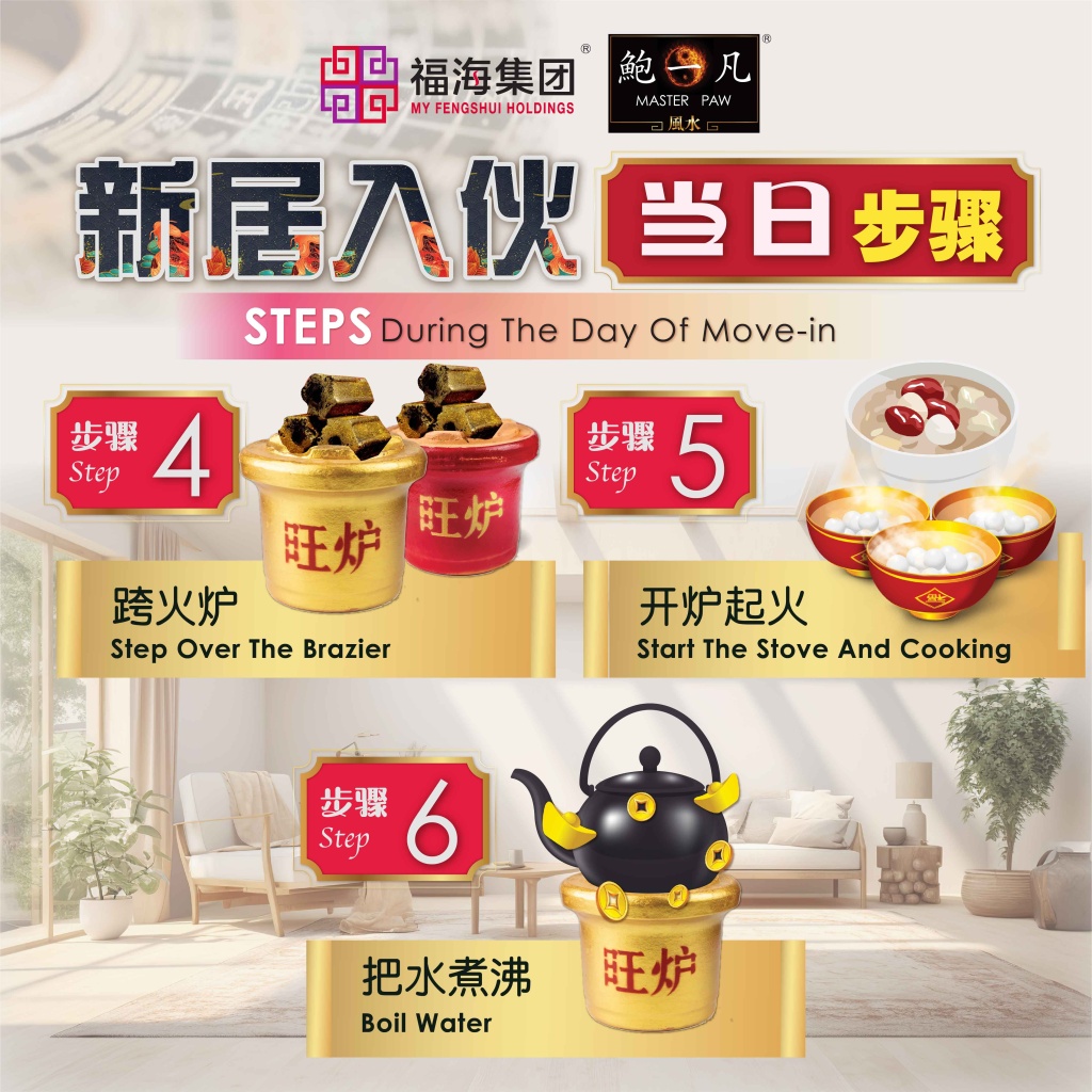 接下来,在大门外侧中央摆上【福海风水金旺炉】,然后放置【发财炭】并点燃,藉此驱散晦气、净化新家的磁场。吉时一到,男主人先用左脚跨过火炉,代表贵人运得到催旺。然后将黄梨从门口滚进屋内,寓意财源滚滚来,接着其余家人依序辈分跨过火炉,同时喊出吉祥话,如“恭喜发财”、“家运兴隆”等,越多越好,气氛才会越兴旺。