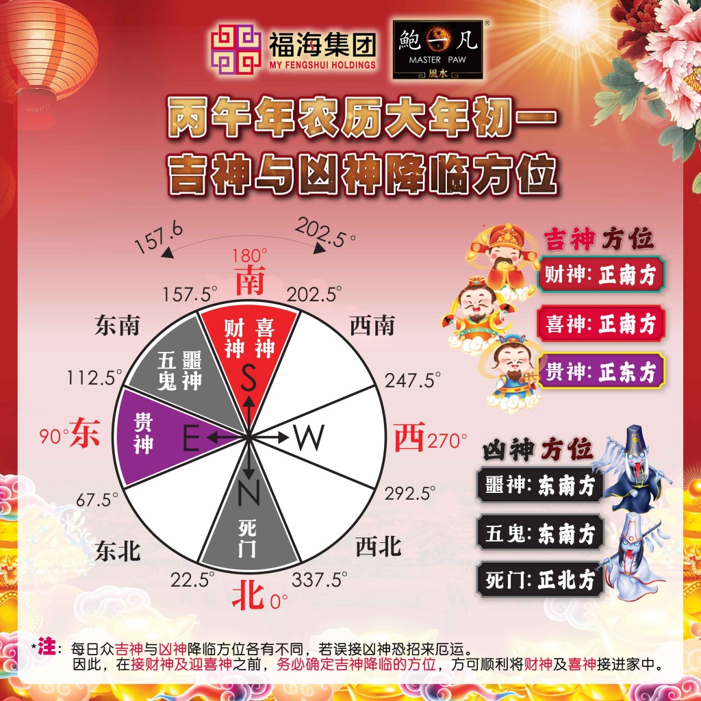 在正式进行仪式前,务必要确认吉神与凶神的降临方位。在大年初一当天,财神和喜神将会坐落在【正南方】、贵神坐落在【正东方】;至于凶神,噩神和五鬼坐落在【东南方】、死门则坐落在【正北方】。鲍一凡老师提醒,在接财神迎喜神之前,必须使用指南针或手机指南针来确认准确方位,凶神所在方位切勿面对或接引,以免影响整体运势。