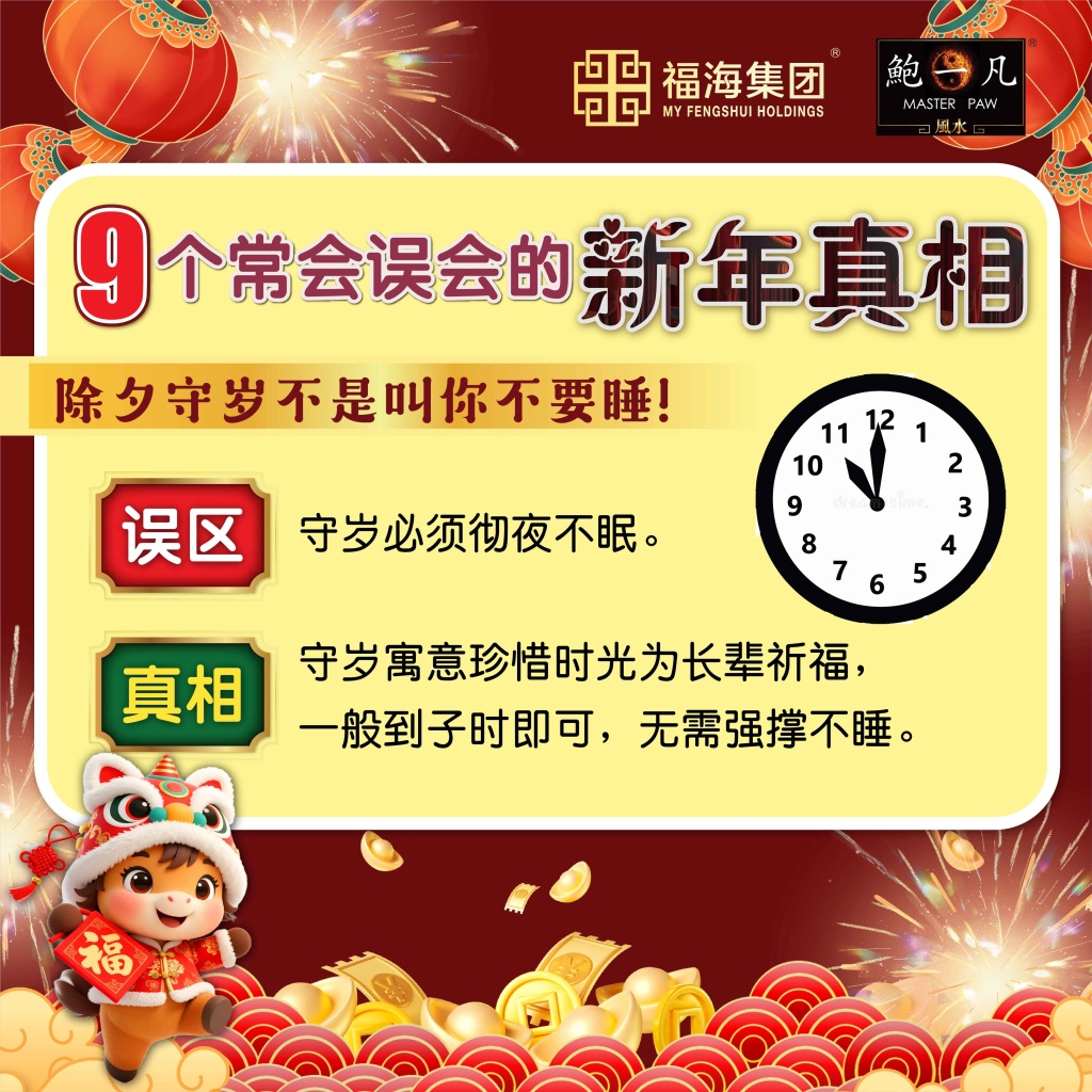 在风水玄学上,晚上11点到凌晨1点的“子时”是新年旧年交替、天地气场转换的关键时刻。传统认为,只要一家人在这个时段里保持清醒、灯火通明,共同度过这个“交子”时刻,就足够凝聚家中的旺气,迎接新春的吉气了。之后安心去睡,并不会影响运势。所以,守岁讲究的是情意和仪式感,而不是一味地强撑不睡!