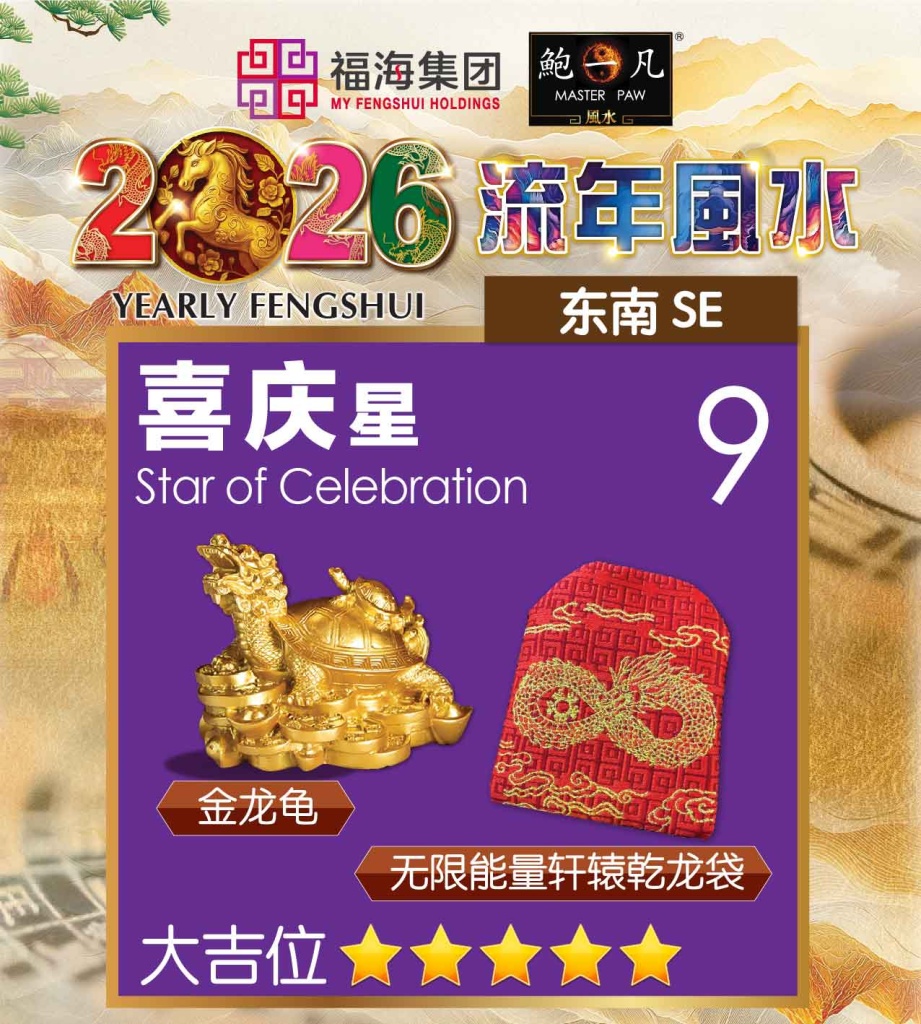 2026丙午马年,流年飞星中九紫右弼星(俗称喜庆星)落在东南方,属于大吉位。九紫属火,为当运的大吉星,主人缘、桃花、贵人、名气,也象征喜事临门、事业曝光度提升,特别利于想突破现状、扩大影响力的人。