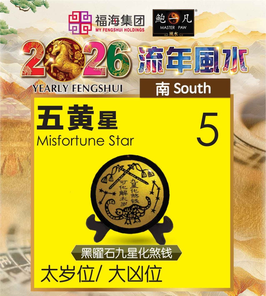 2026年五黄廉贞星(俗称五黄星)飞临正南方。五黄属土,被称为“第一凶星”,主意外、破财、病痛、是非与情绪失衡,一旦被触动,容易连锁出问题,务必谨慎应对。而在丙午年里正南方也是太岁位,若有动工或动土之事,切忌在正南方进行。