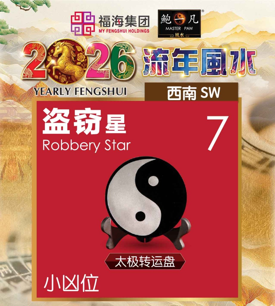 【化解秘诀】2026年七赤破军星(俗称盗窃星)飞临西南方。七赤属金,主口舌是非、破财失误、盗损纠纷,也容易因说错话、人情处理不当而惹麻烦,特别影响合作关系与家庭气场。化解关键在于泄金、降躁,可摆放太极转运盘、深色系饰品、化煞葫芦,稳住气场,同时减弱冲动与争执能量。
