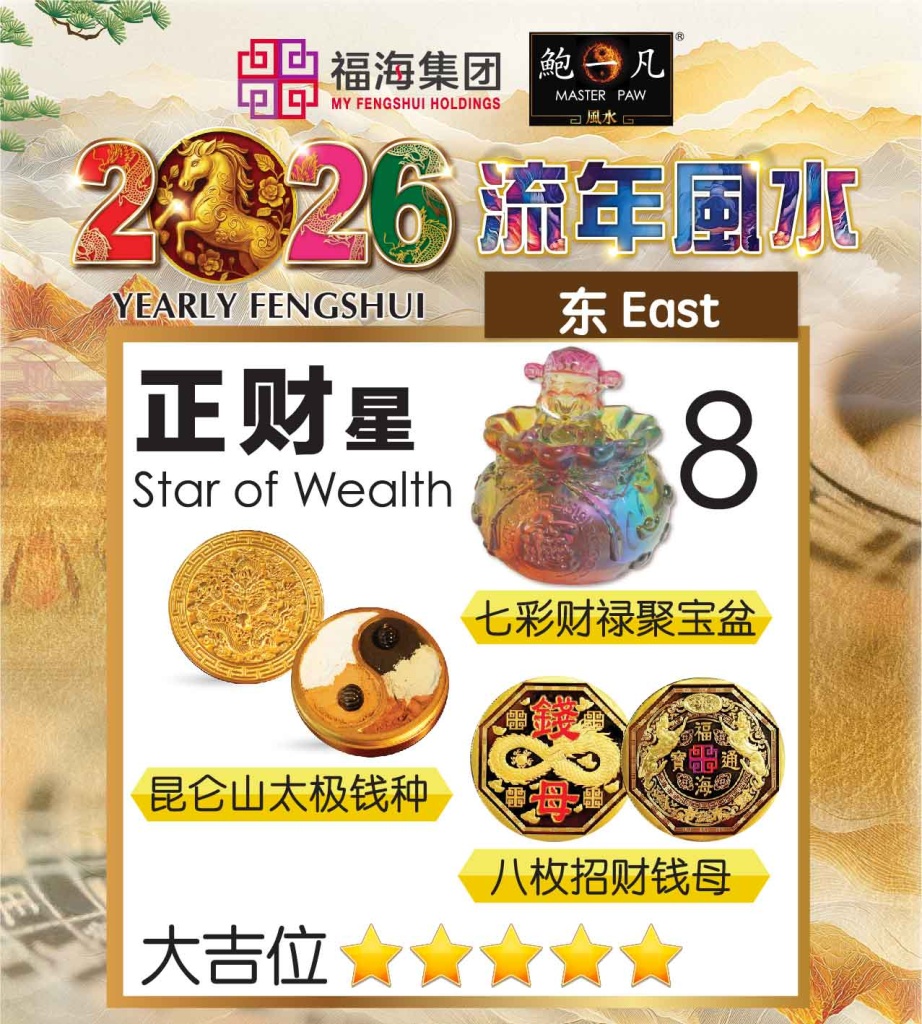 【催旺秘诀】2026年八白左辅星(俗称正财星)飞临正东方。八白属土,为马年里重要的正财吉星,代表稳定收入、事业累积与长期回报,特别有利于踏实经营、一步一脚印累积成果的人。催旺重点在于稳、聚、亮。正东方宜保持整洁明亮,可常开灯或引入自然光,象征财路畅通。摆放福海招财钱母、七彩财禄聚宝盆、昆仑山太极钱种、黄水晶摆件,有助聚财守财,让努力更容易看见回报。