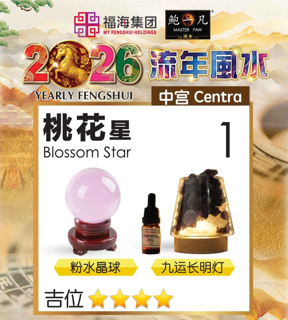 【催旺秘诀】2026年一白贪狼星(俗称桃花星)飞临中宫。一白属水,代表人缘、桃花、贵人星,也寓意灵感、学习力与沟通机会,中宫主全局,此星到位,喻示着全年人际与机遇流动明显加快。催旺关键在于柔、润、净。中宫宜清爽明亮、气流顺畅,可摆放粉水晶球、粉水晶求、九运长明灯,增强亲和力与情感能量,也有助缓和关系、吸引贵人靠拢。