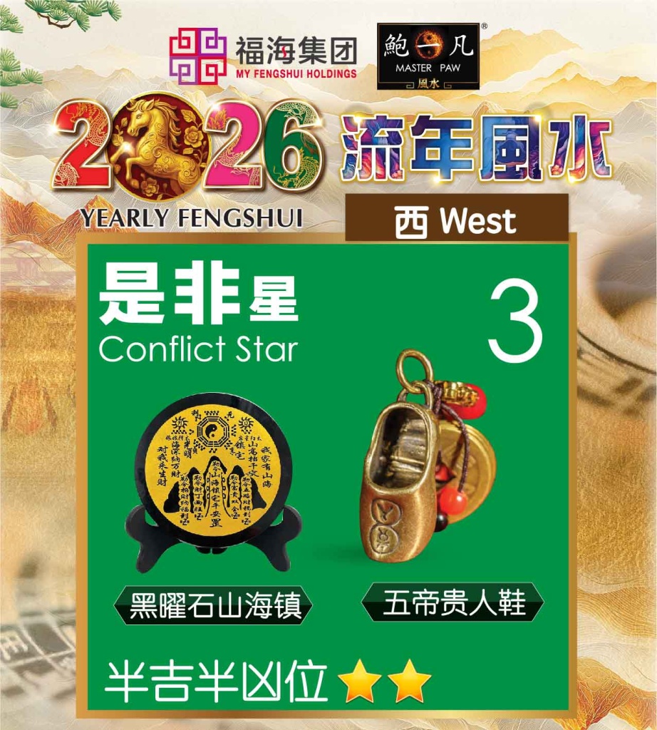 【化解秘诀】2026年三碧禄存星(俗称是非星)飞临正西方。三碧属木,为是非口舌星,主争执、误会、情绪起伏,容易因沟通不良、脾气急躁而引发人际摩擦,职场与家庭关系都要留意。化解关键在于制木、降冲。正西方宜安静克制,可摆放黑曜石山海镇摆件、深色系化煞物、红色小饰品,以火制木,压下冲动与是非气场。
