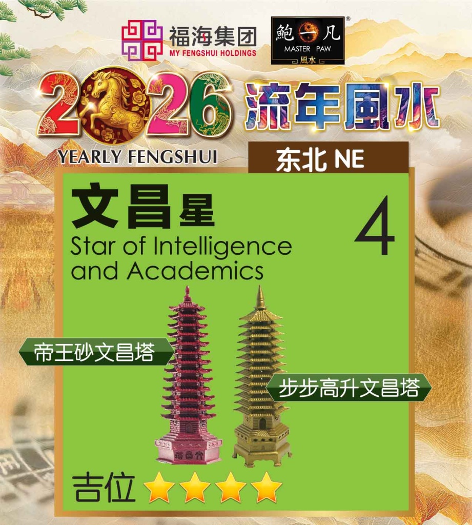 【催旺秘诀】2026年四绿文曲星(俗称文昌星)飞临东北方。四绿属木,为文昌与智慧之星,主学习、考试、创作、策划与口才表达,对学生、进修族与从事文职、创意工作者尤其有利。催旺重点在于静、雅、清。东北方宜安静明亮,可作为书房或学习区使用。摆放帝王砂文昌塔、步步高升文昌塔、文昌笔、书籍,有助集中思绪、提升理解力与表现力。