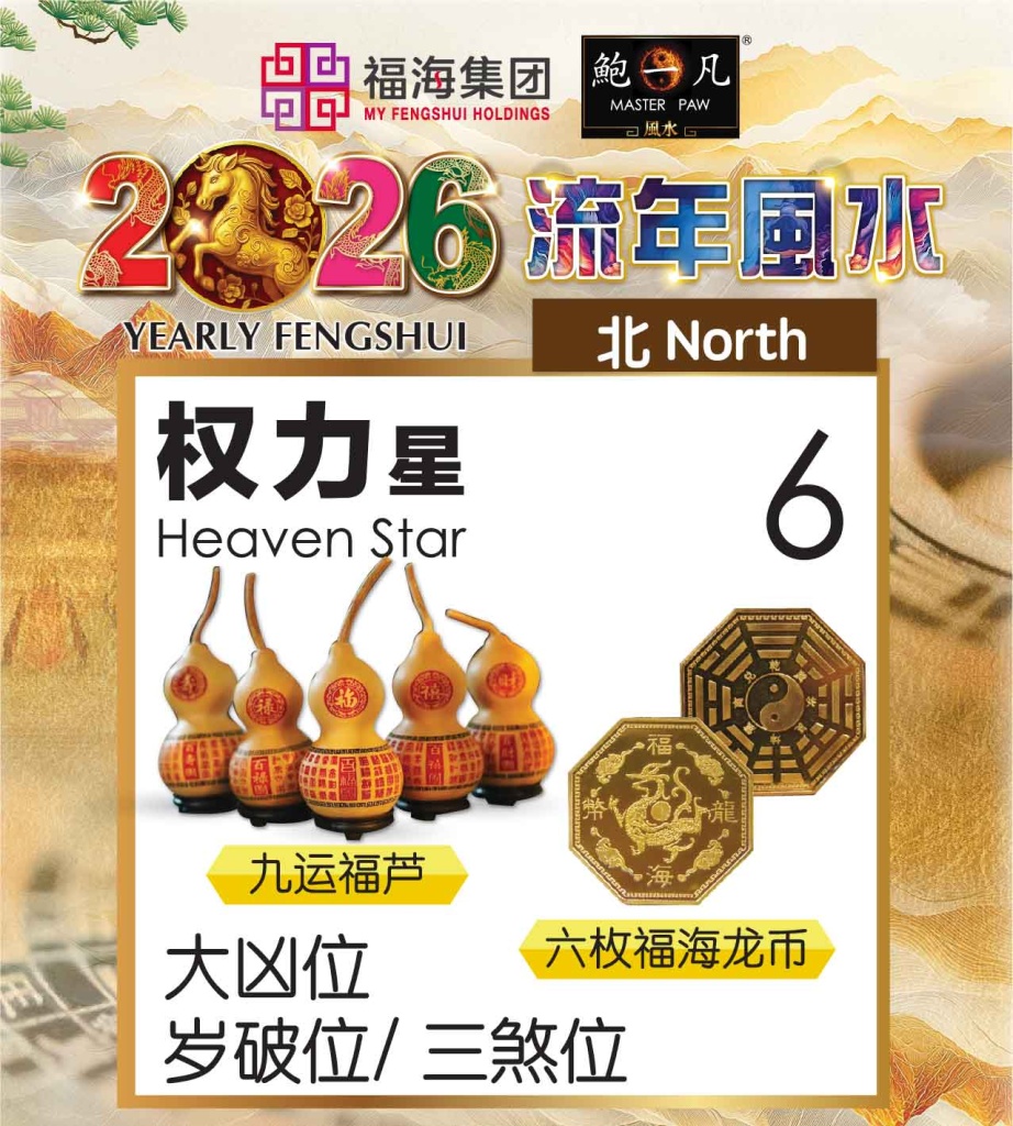 【化解秘诀】2026年六白武曲星(俗称权力星)飞临正北方。六白属金,为权力、事业与偏财星,主升职掌权、决策力、行动执行,也利于创业、管理层与需要拍板定案的人。化解重点在于清、稳、动中有序。正北方宜整洁明亮,可适度活动但不宜躁动。摆放九运福芦、六枚福海龙币、铜质风水摆件、金属饰品,有助凝聚权威气场,提升事业运与贵人助力。