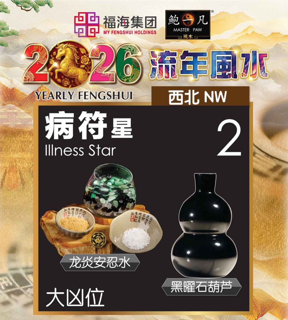 【化解秘诀】2026年二黑巨门星(俗称病符星)飞临西北方。二黑属土,为病符凶星,主健康下滑、慢性不适、精神压力,也易让长辈运与整体稳定度受影响。化解关键在于泄土、养静。西北方宜安静通风,不宜动土装修。可摆放黑曜石葫芦、龙炎安忍水、铜制化煞物,以金化土,缓解病气累积。