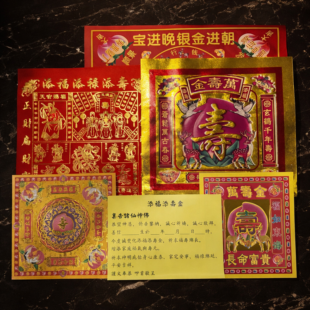 添福添寿金用于添福延寿福寿并进之用添福添寿金,主要用于为自身、家人及长辈祈愿福分累积、岁运平顺与身心安稳。在民间信仰中,「福」象征生活顺遂与资源充足,「寿」代表安定、延续与不折不耗。透过多款福寿金纸的组合焚烧,寓意让福气持续累积,使人生节奏走得更稳、更久。