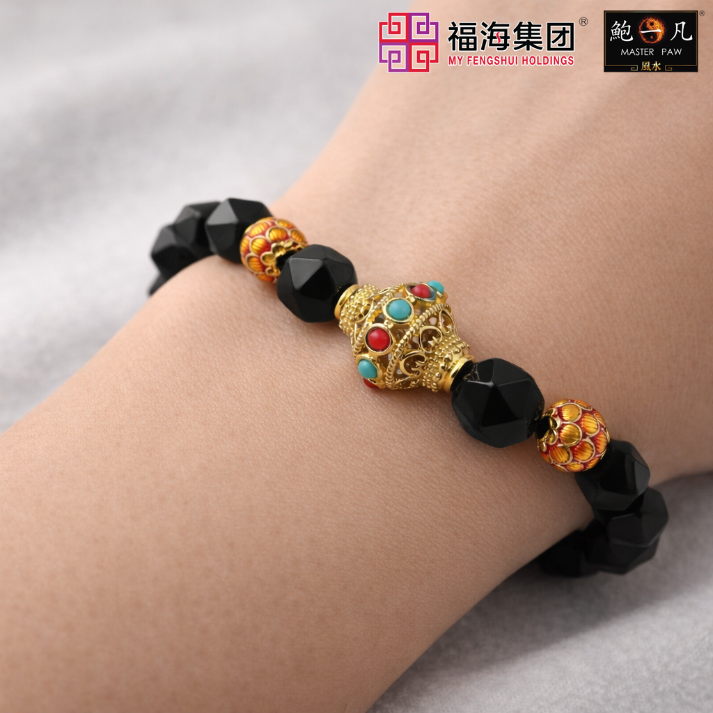 整体以黑曜石切面珠为主体,珠面多角切割,光泽内敛而深沉,在不同角度下呈现稳重的反射层次。搭配鎏金感金属核心珠件,使整体在沉稳中透出贵气,形成强烈但不张扬的存在感。