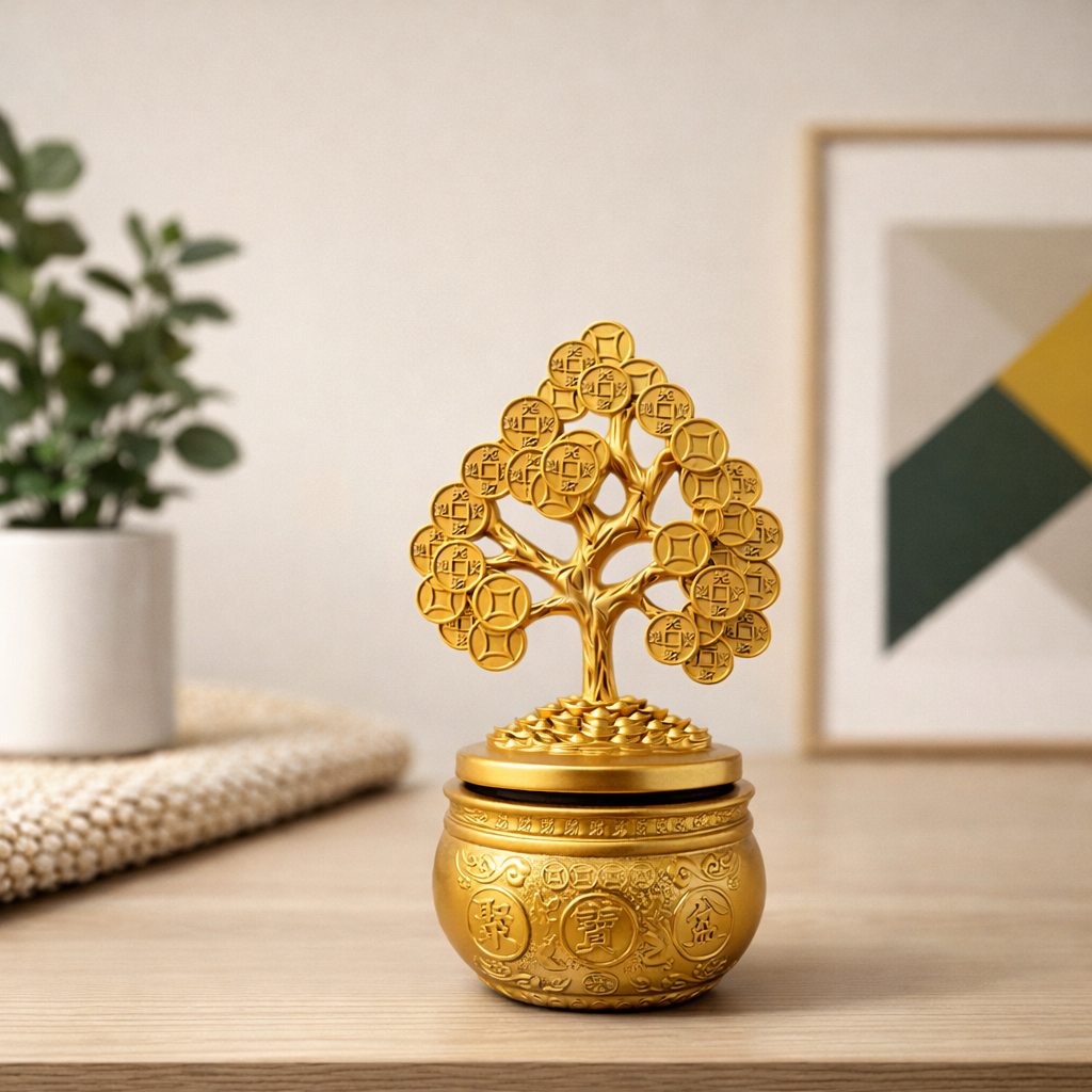 这座招财转运金树,以传统「金树生财」的意象为核心设计。树干挺立、枝叶舒展,象征财路延展、根基稳固;树叶由层层钱纹组成,寓意财源累积、细水长流,不是一时之财,而是能长期滋养生活的稳财之运。金树下方承载聚宝金盆,盆身雕刻吉祥纹样与聚财文字,象征进财有库、守财有器,让来到身边的财气不易流失。整体造型比例和谐,上轻下稳,符合风水中「上纳财、下守财」的布局概念。