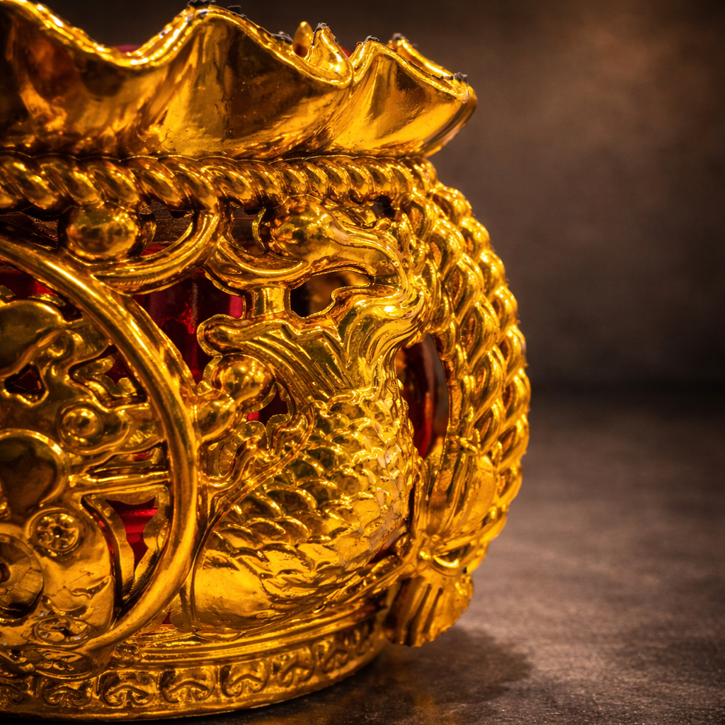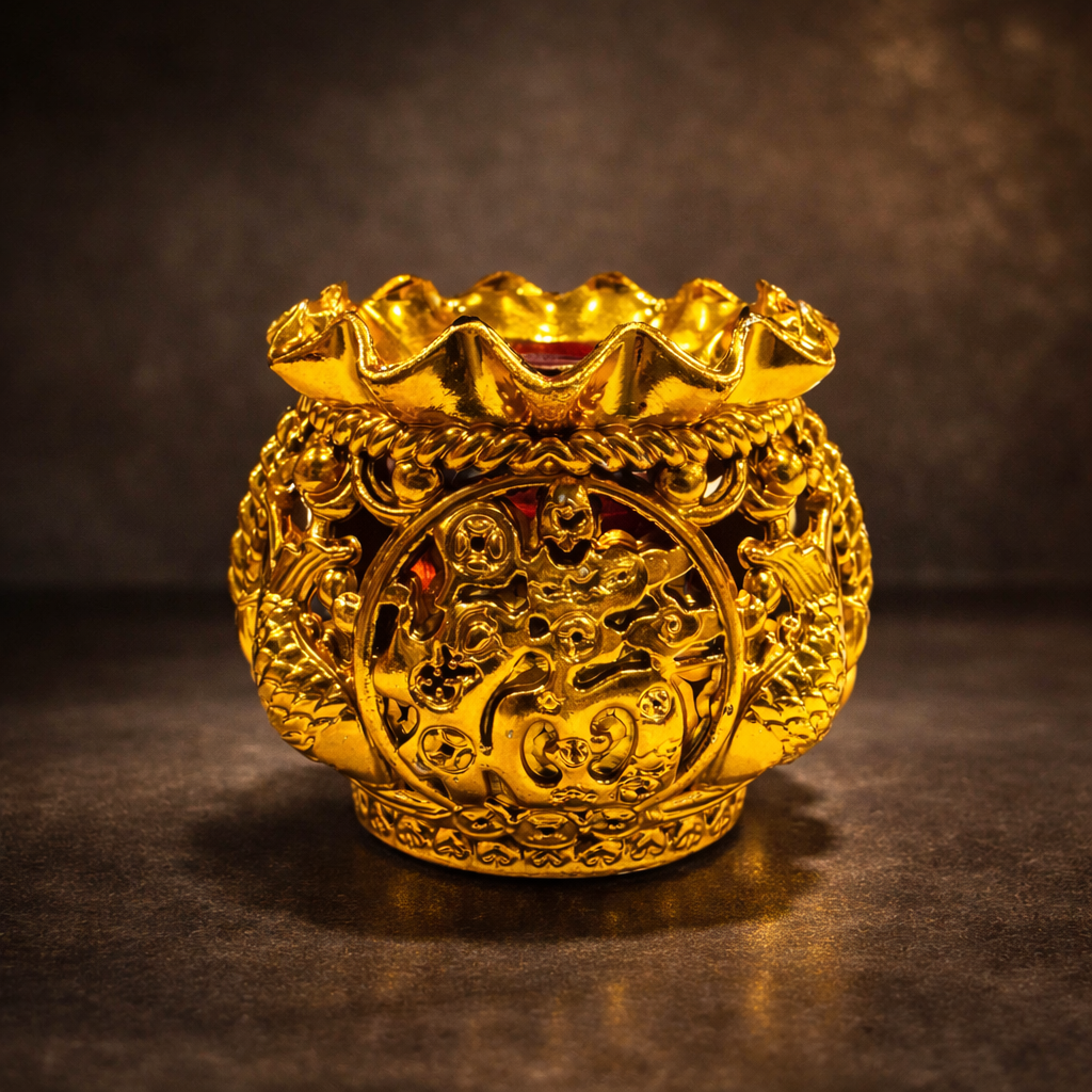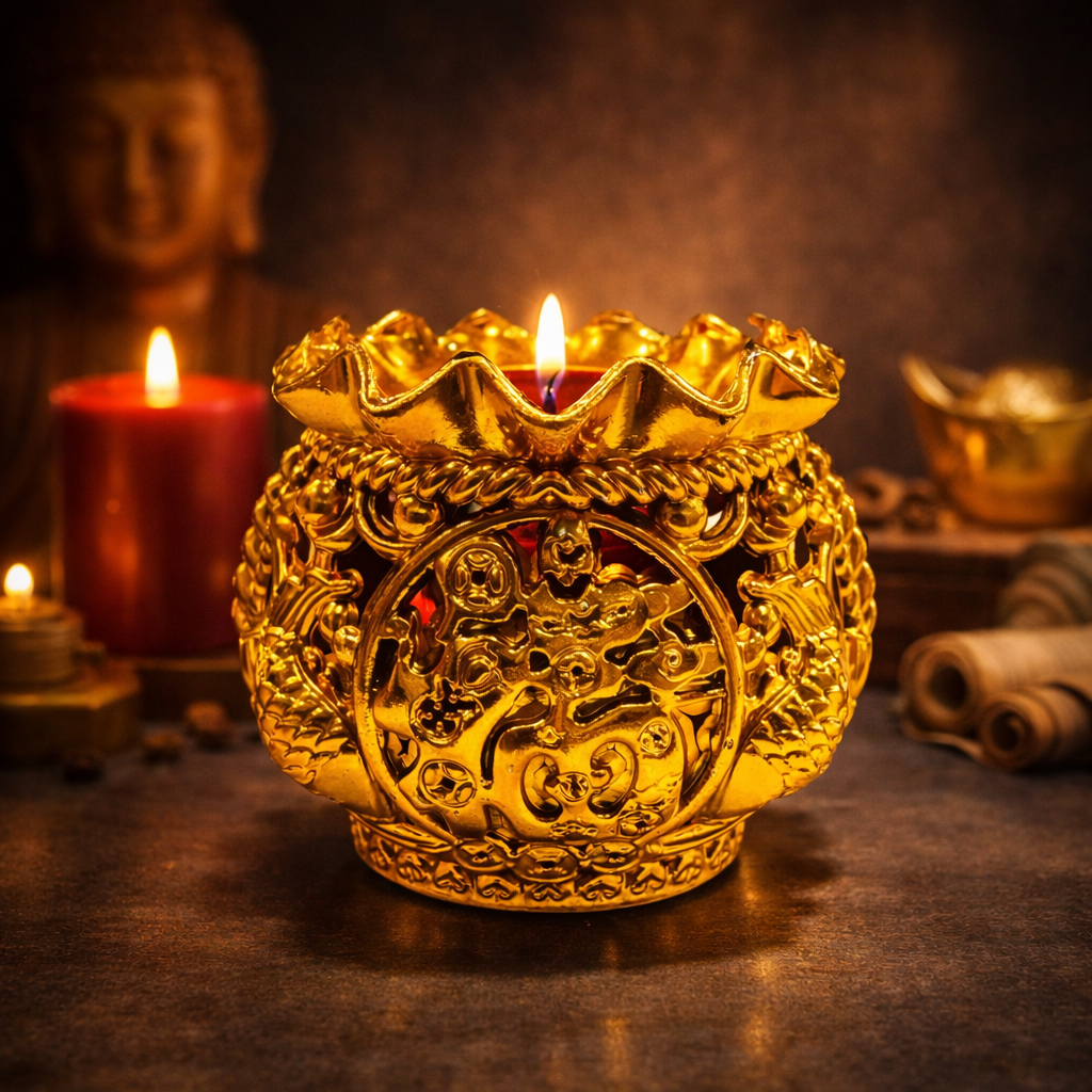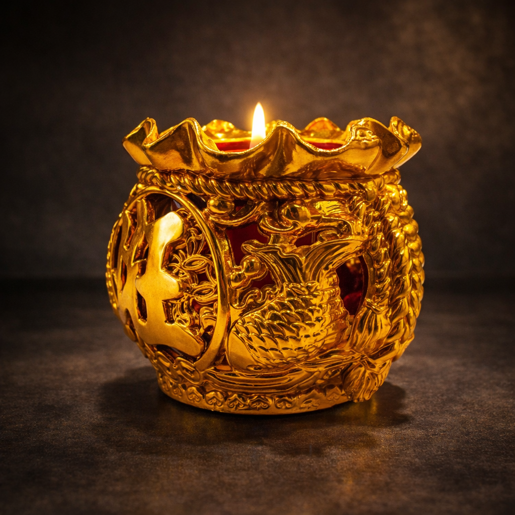 烛台主体采用鎏金色调设计,整体轮廓如福袋收口,象征福气聚拢。外圈环绕立体纹饰,纹理层次分明,寓意好运累积、福运成形。正面中央以立体圆纹为视觉核心,象征圆满、守成与福气归位,使整体画面集中而安定。