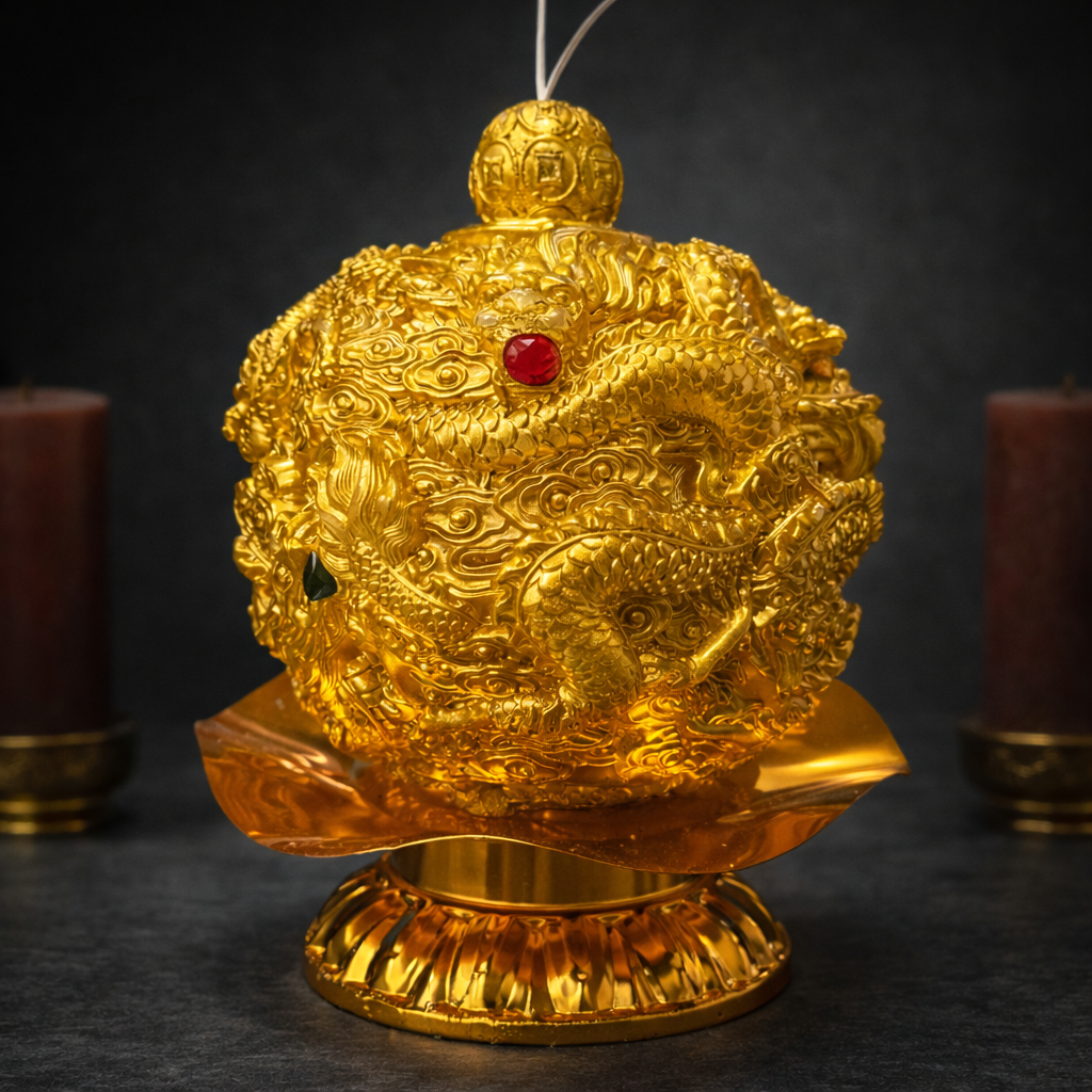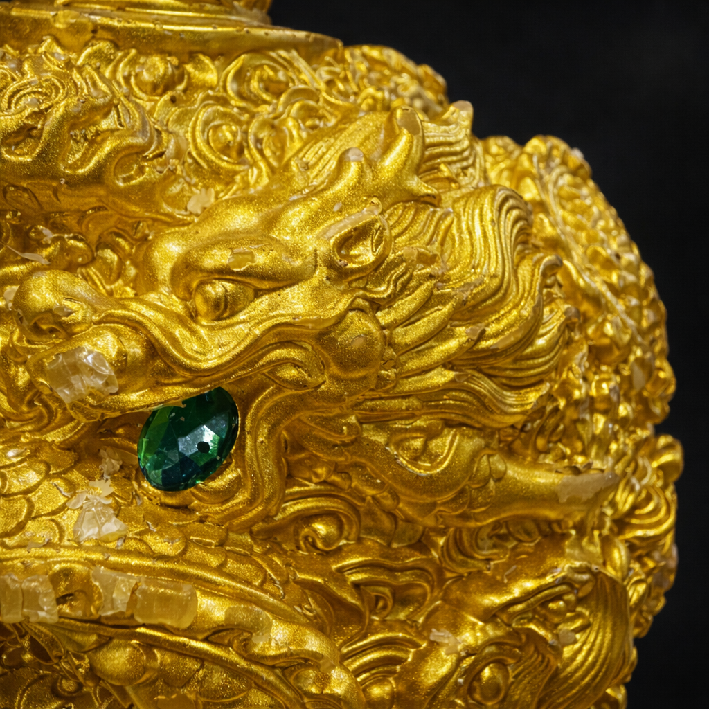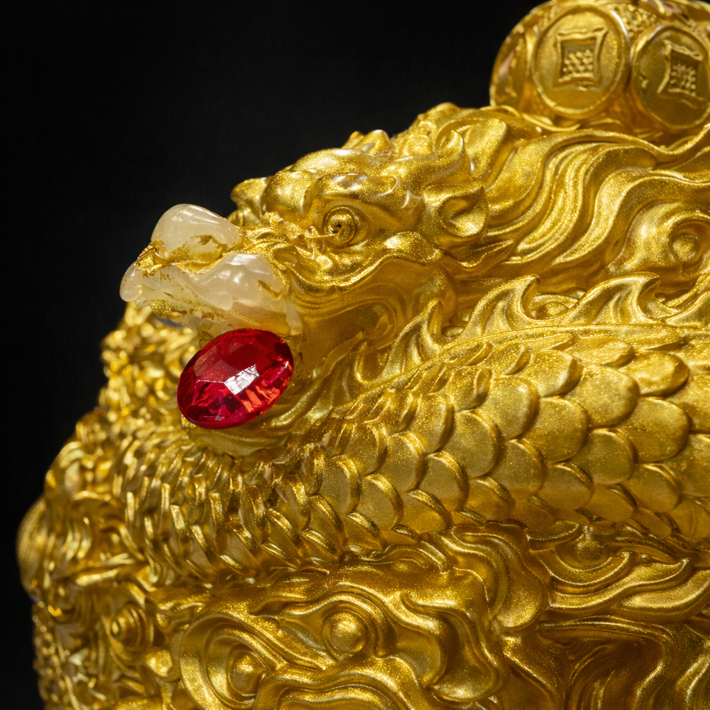 烛体主体采用通体鎏金设计,龙身环绕成势,龙鳞、云纹与旋动纹理层层交织,形成持续运转之态,象征运势并非停滞,而是在流动中完成转化。红色宝点点缀其间,寓意关键能量节点被点醒,使原本受阻之势得以突破、转换方向。