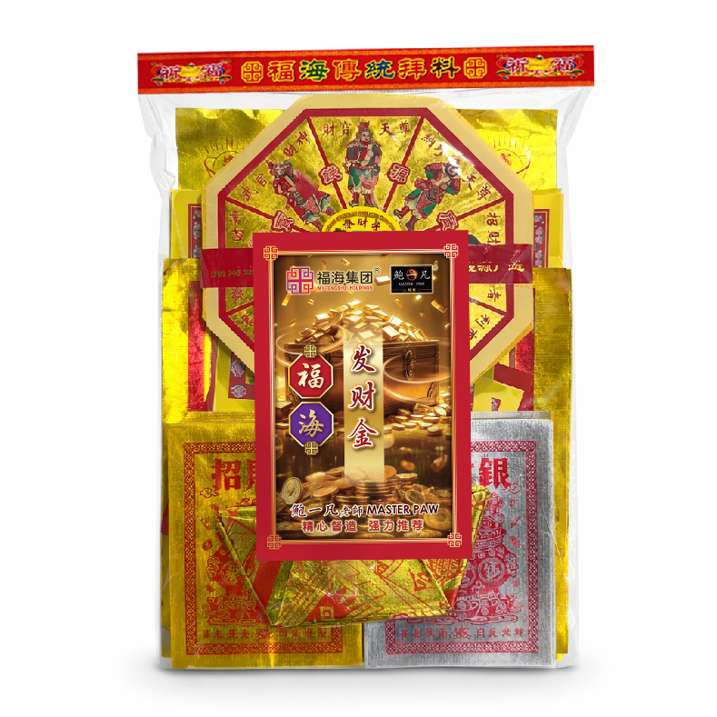 福海发财金拜料用于启财聚财稳财守成之用福海发财金拜料,主要用于表达对财运顺行、生意兴旺与资源累积的祈愿之意。在民间信仰中,「发财」并非一夜之得,而是财路顺、机会稳、进出有序。透过诚心焚烧发财金拜料,象征开启正向财流,使财运运行更顺畅,也更容易守住成果。福海发财金拜料常用于开市前、重要交易之前、事业推进阶段或希望财务节奏更稳定之时供奉,寓意财来有路、财去有度,整体财气聚而不散。