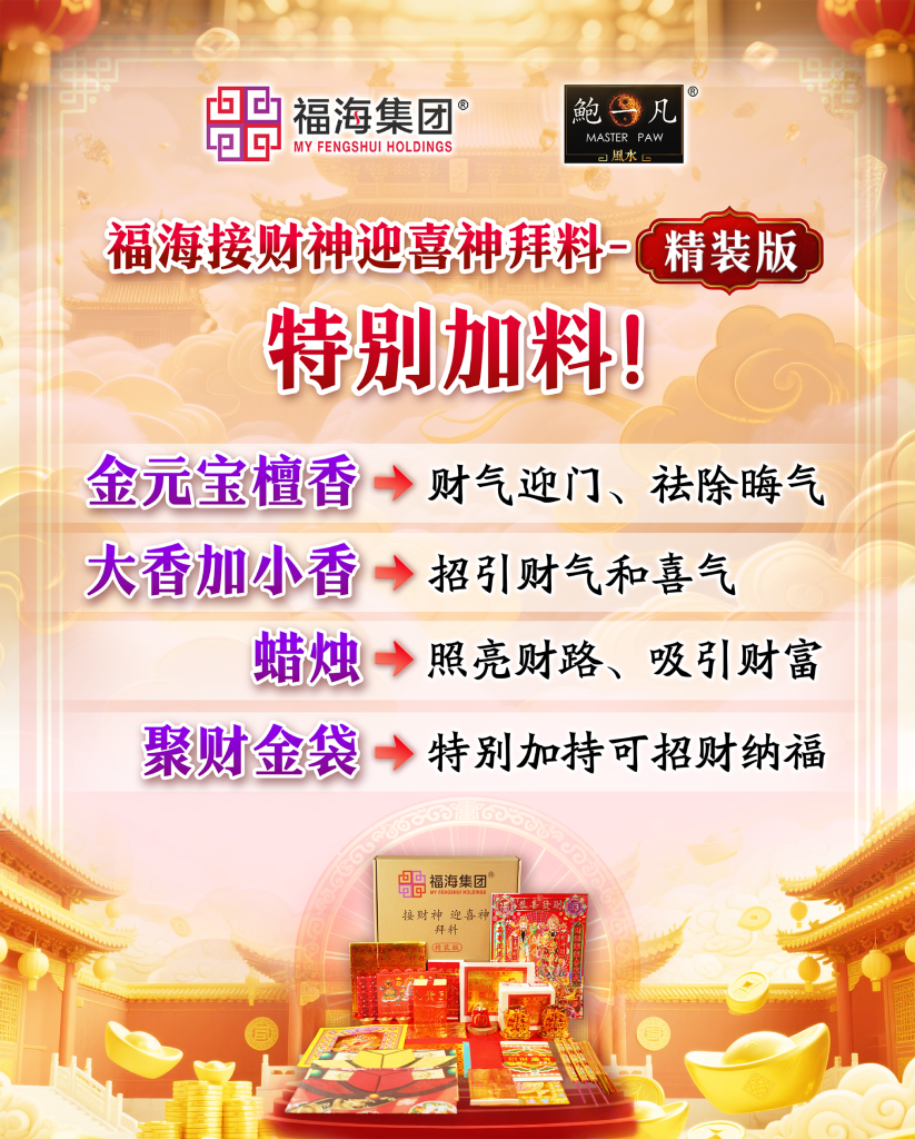 既然要接财神,那么不仅要用正确的方法,也要用对的拜料,鲍一凡老师每年推出的接财神拜料,是符合传统,而且最有效的拜料,用对拜料了,接财神的时候就可以事半功倍!连续推出多年的福海接财神拜料,不仅品质佳、口碑好,很多人用了接财神拜料,加上鲍一凡老师推荐的方式接引财神后,财运不仅有好转的迹象,一整年的也财运亨通、顺风顺水。而今年丙午年在天时有利的条件下,更能同时迎喜神,为此福海集团新推出了【2026福海接财神迎喜神拜料-精装版】,这是市场唯一能同时接财神和迎喜神的拜料,只要拥有这份分量充足的拜料,就能顺利接迎财神和喜神!