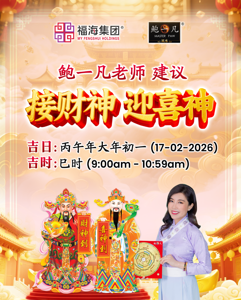 接财神,是一件隆重的事情,不仅要拥有一份好的拜料,更需要选定好日子,经过鲍一凡老师的精心估算,迈入马年,丙午年大年初一(17-02-2026)为最佳的接引财神和喜神的吉日,最佳吉时则是在巳时(9:00am-10:59am),而若情况不允许的话,鲍一凡老师也建议了其他吉时供民众参考,只需再配合鲍一凡老师详细记载的步骤纸,就能够顺利接引财神和喜神了。