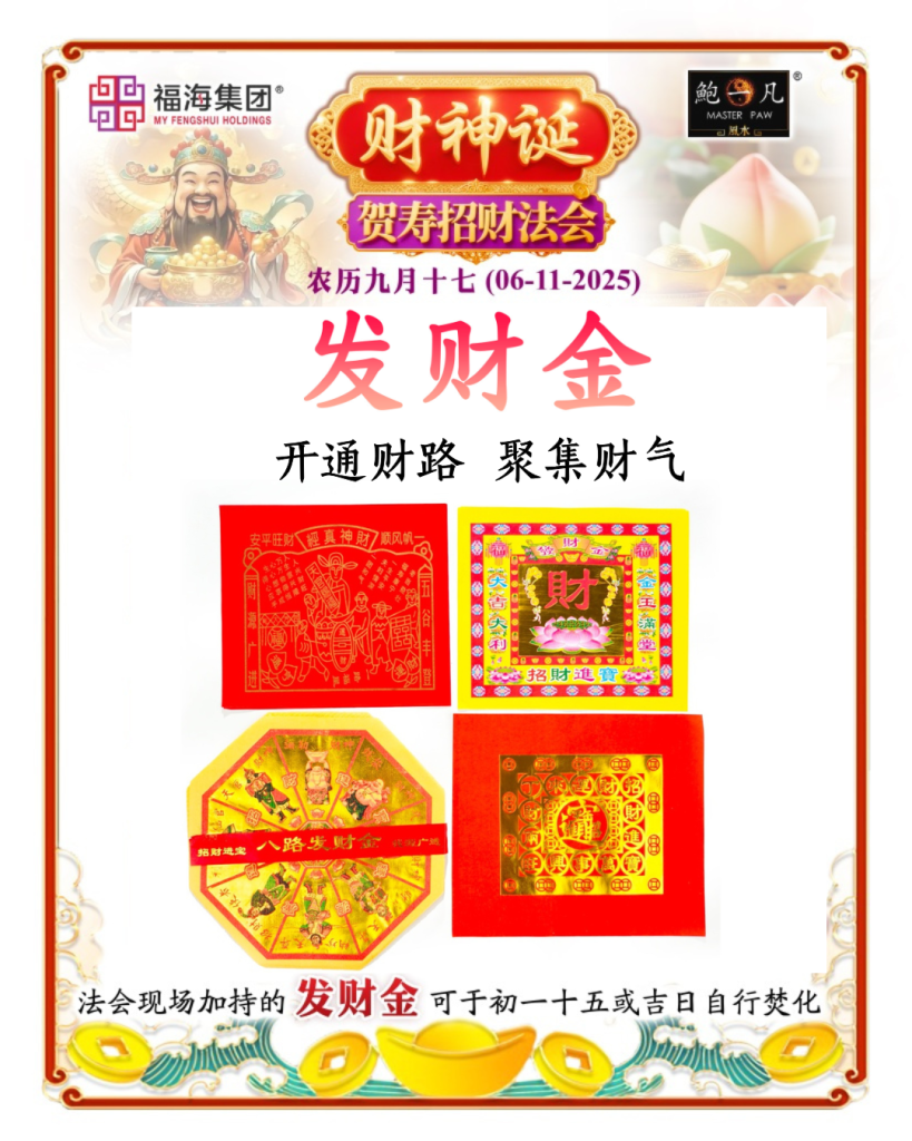 聚旺气场:法会结合诵经、供奉财帛星君祝寿包,长寿面,发财糕以及加持品发财金,聚集天地财气,不仅助旺个人运势,更能庇佑家宅与事业顺畅、贵人显现。