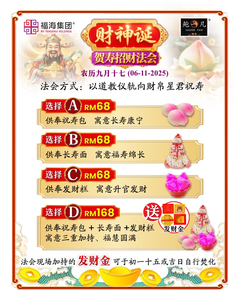 本场仪式四个选项,【配套A:RM68 供奉祝寿包】、【配套B RM68 供奉长寿面】、【配套C RM68 供奉发财糕】、【配套D RM168 供奉祝寿包+长寿面+发财糕(原价RM204)】。配套D将可获得仪式现场加持的发财金一份;选择其他配套者也能另外加购,加持发财金将统一与仪式结束后依照订单顺序发货。