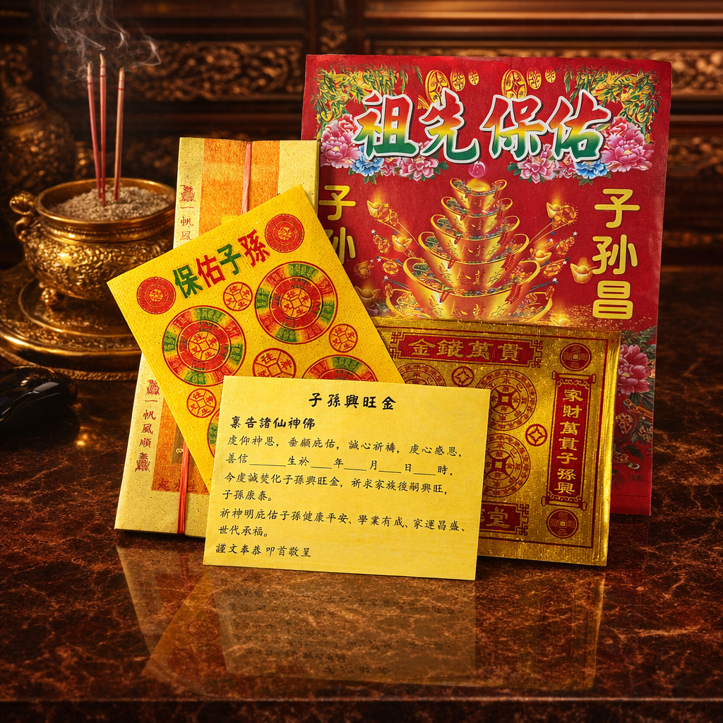 子孙兴旺金用于祈愿传承家运延续之用子孙兴旺金,主要用于向祖先与神明表达对家族延续、家运稳固与后代平顺的祈愿之意。在民间信仰中,「子孙兴旺」并不仅指人数多寡,更象征家族根基稳固、代代平顺、福泽相承。透过诚心焚烧,寓意让家中传承之气得以延续,使家庭关系、家运节奏与后代发展更为安定。子孙兴旺金常用于祭祖、重要节日、家族聚合之时供奉,也适合在心中希望家庭更稳、后代发展顺遂之际使用,象征家运不断、福气相续。