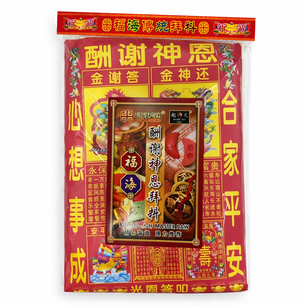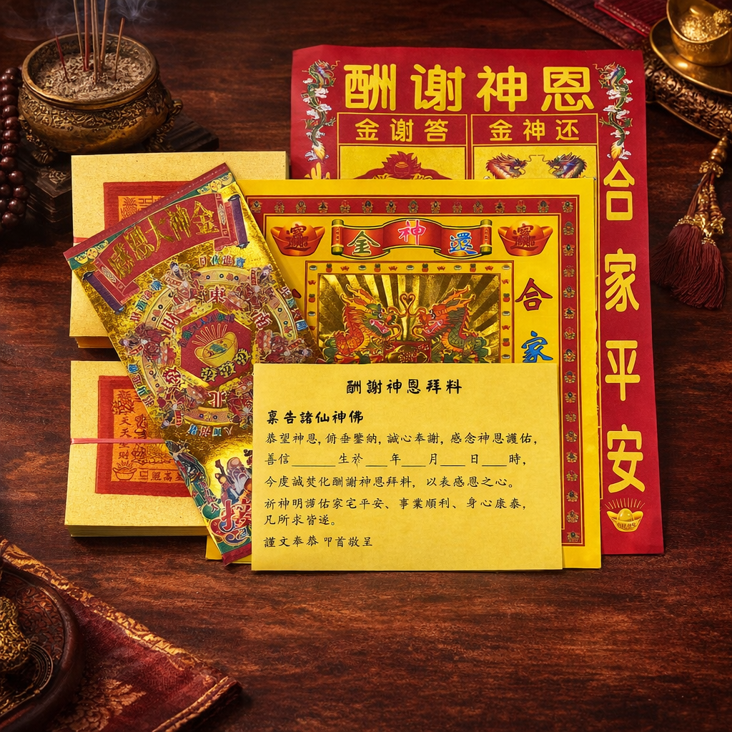 酬谢神恩拜料用于感恩回谢圆满心愿之用酬谢神恩拜料,主要用于向神明表达感恩与回谢之意。在民间信仰中,祈求与酬谢同为一个完整的循环。有求之后懂得回谢,象征心意圆满、因缘有始有终,也代表对神恩与庇佑的珍惜与尊重。酬谢神恩拜料常用于愿望达成、事情顺利完成之后,或在心中感念神明庇佑之时焚烧,寓意感恩不忘、福缘延续,使往后行事更为平稳顺畅。