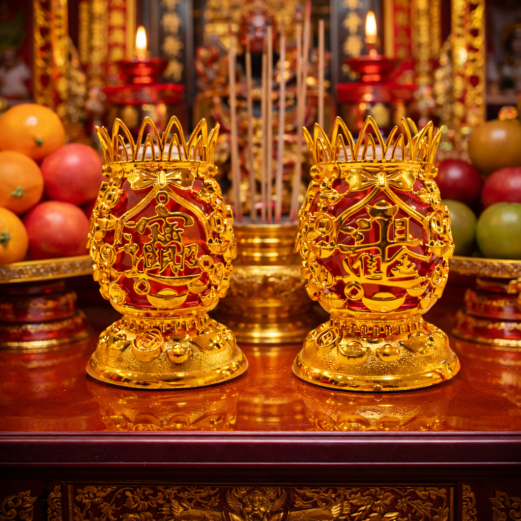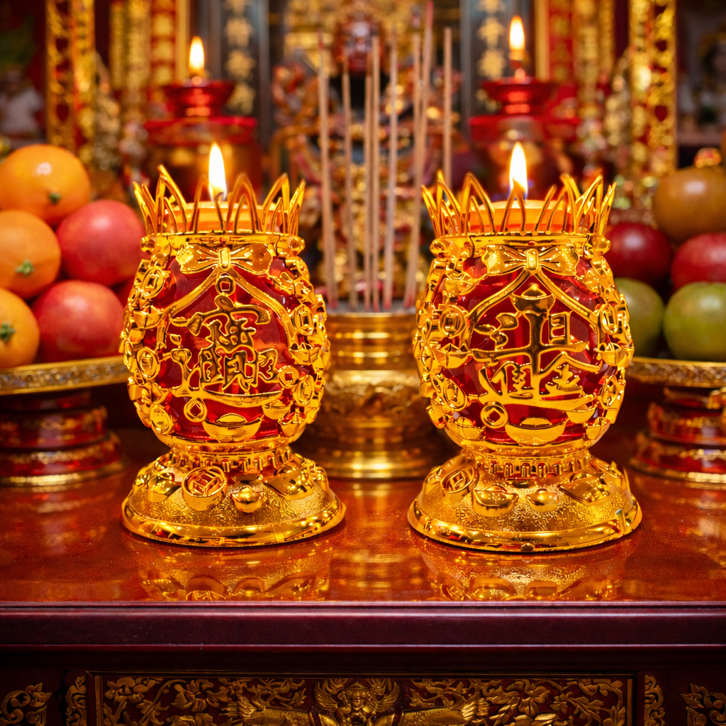 招财旺来对烛以「招财在左、旺来在右」为设计核心,采用成对陈设结构,象征财与运各归其位、相互呼应,适合作为神台供奉、法会仪式或重要时点启用的正式对烛配置。