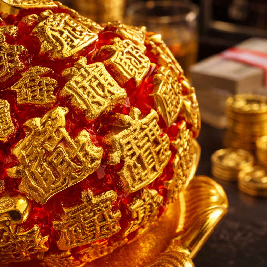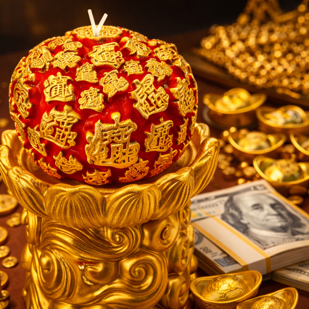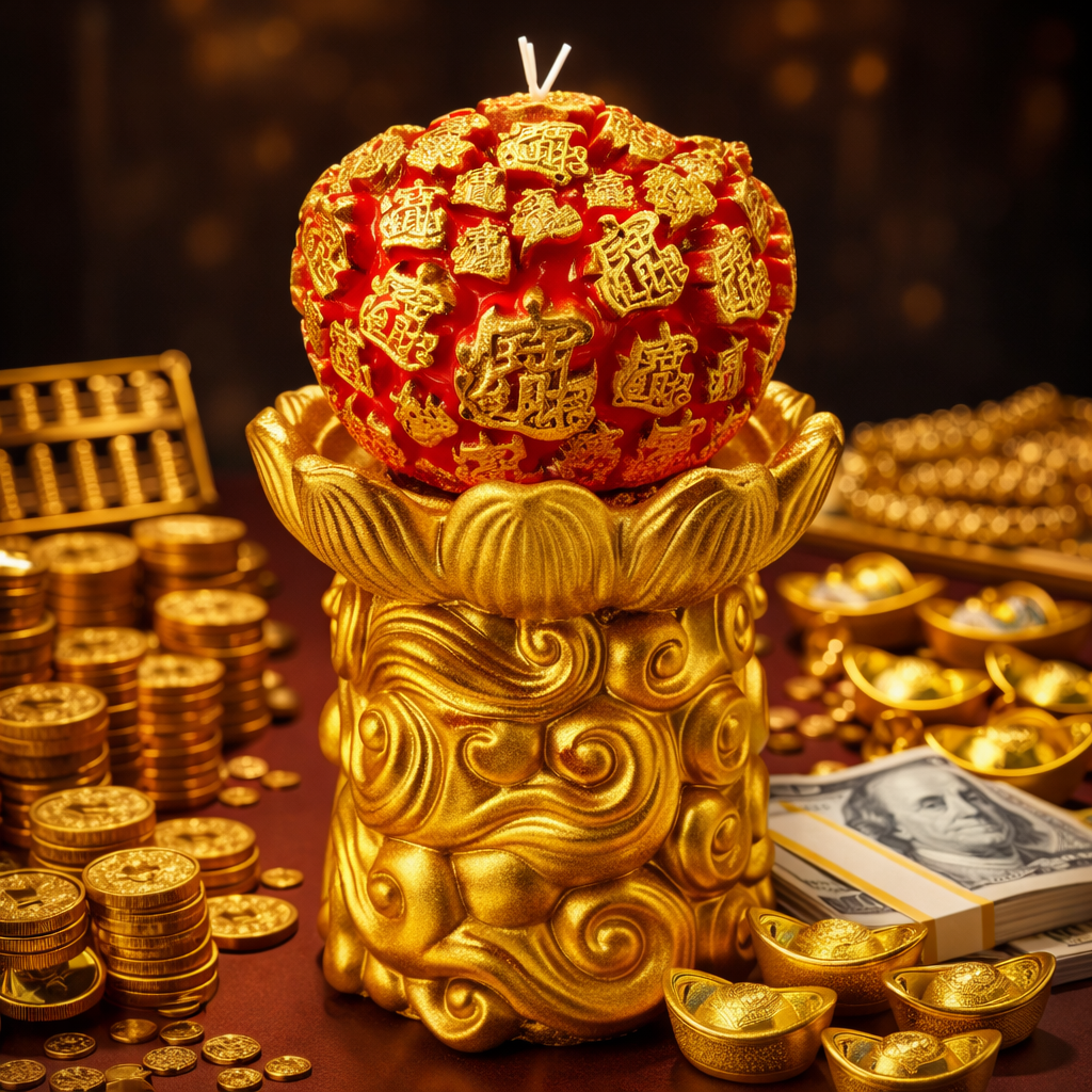 招财进宝酥油烛以「财运启动」为设计主轴,整体造型采用红金配色结构,视觉集中、寓意明确,适合作为神台供奉、招财仪式与重要节气启用的核心酥油供烛。