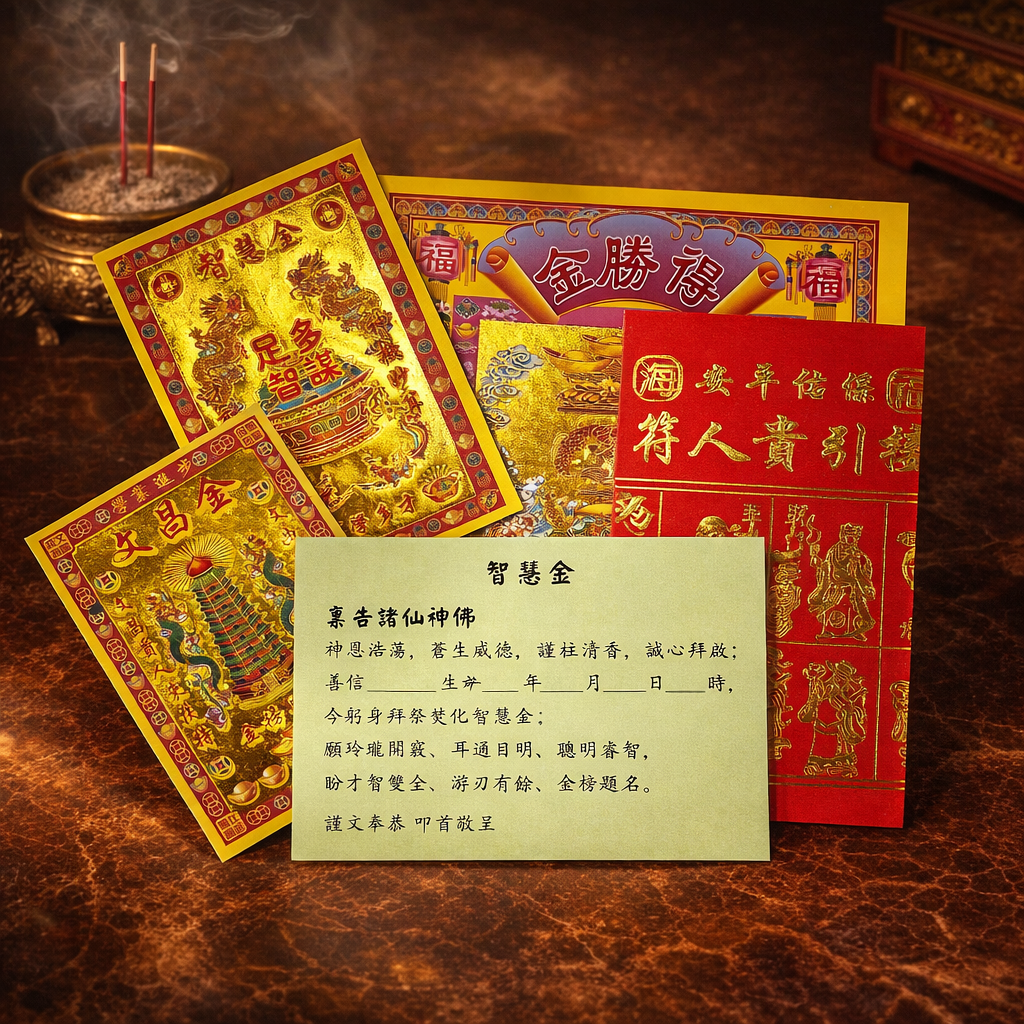 智慧金用于祈愿思路清明判断稳定之用;智慧金,主要用于学习、思考、决策与判断相关之祈愿,适合学生、上班族、经营者、管理者,在需要冷静分析、清楚思路、减少混乱时,以诚心进行焚烧使用,表达对智慧与明晰判断的祝愿。在民间观念中,「智慧」并非聪明一时,而是思路顺、判断稳、取舍清楚。焚烧智慧金,象征为自身注入沉静而有条理的能量,让思考不急躁,决策不偏差。此金适合阶段性或长期焚烧使用,尤其适合面对考试、重要决定、复杂事务之前。